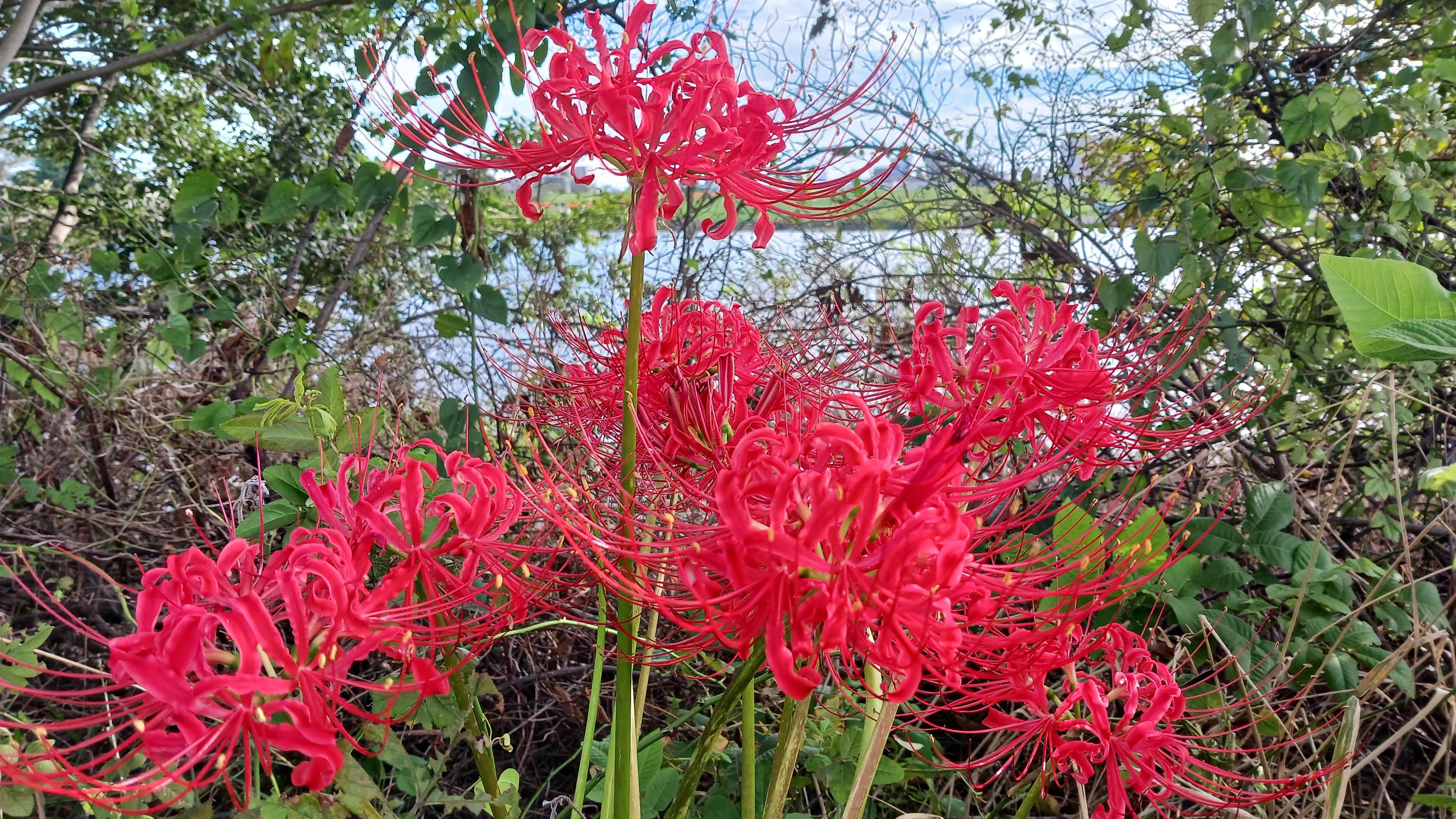 春は桜、そして秋はこの花彼岸花。やっと春を迎えた頃の薄墨色から黄色紫色々咲いて暑い盛りを過ぎた頃、情熱的な真っ赤っか。これぞ、秋。まさしく秋の彩り。そして、収穫の秋だから・・誰もがみんな太る秋!