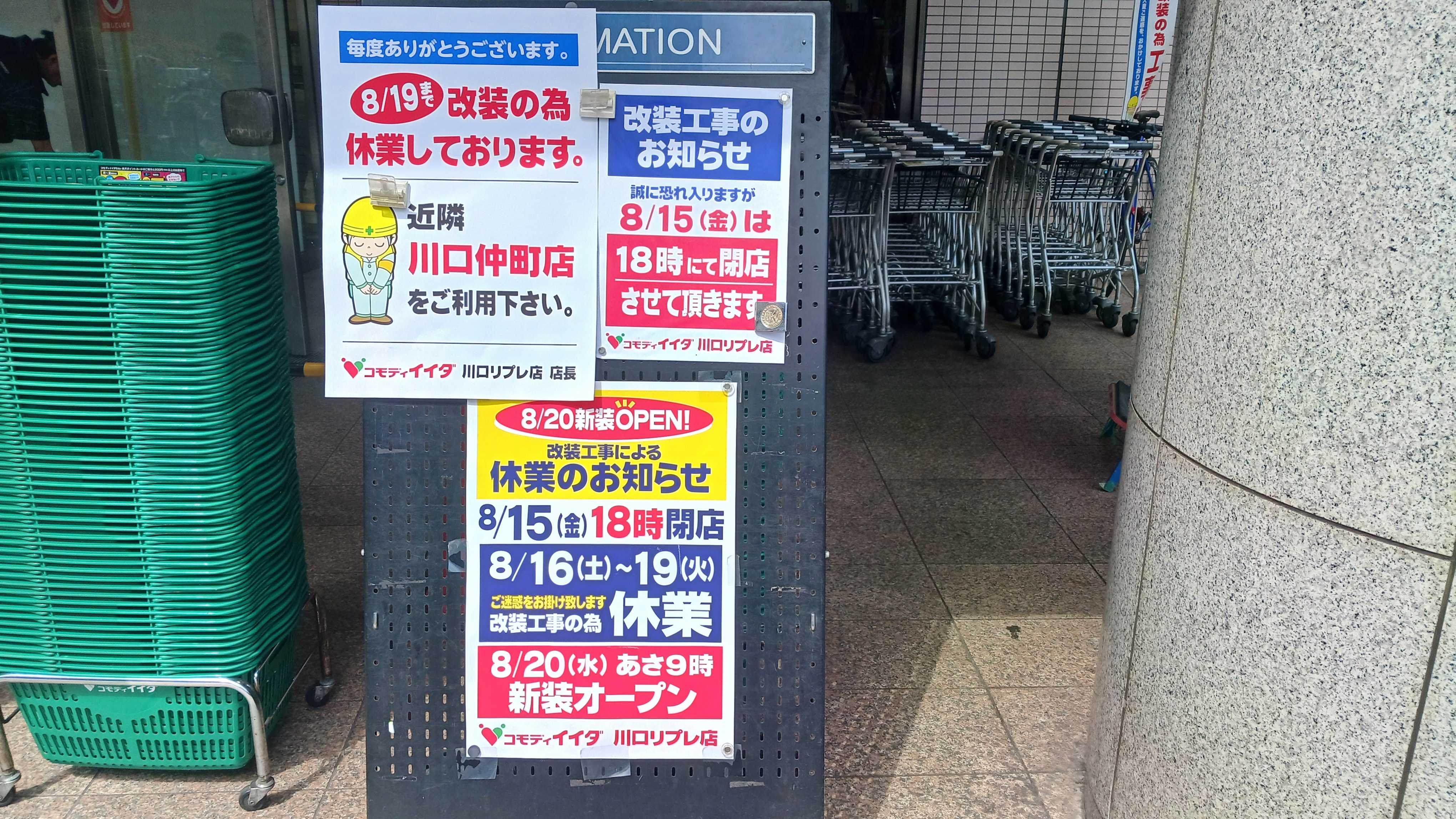 川口駅西口にある「コモディイイダ 川口リプレ店」が改装工事の為8/19まで休業中。8/20に新装オープンするらしい。どうしよう?東口の樹モールまで行くしかないか・・