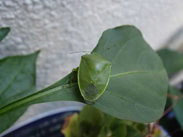 パプリカの葉で休んでいるのはツヤアオカメムシかな?毎年秋になると目にするが、子供の頃に見た記憶は無い。刺激臭が強く、毒性もあるので「触らぬ神に祟りなし」。