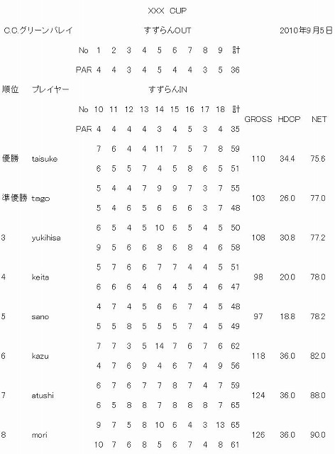 XXXHAZUSHIの新しい活動ですけっこうGOLFが流行っているのと最近フットサルも勝てなくなってきているので...ゴルフコンペXXXcupを開催しました 初めはmoriくんがデビューだし、みんなまだ初心者だったのでちょっとまわりに迷惑かな??って心配してましたけどみんなの協力でスムーズだったし、そのあとの反省会も大爆笑で第1回にしては大成功でした tago:『第2回はどうする??』みんな:『11月であたりでどぅ???』 なんて話がでるくらいやる気でしたねやっぱり実力が近いのでみんなもやる気っすね 爺になってもこのメンバーで続けていきたいしいつかは旅行を兼ねてのゴルフツアーをやりたいので3、9月(サンキュー)でやっていきたいと思ってます ちなみにH坂くんのリュックの大きさネタとAっちゃんの歌舞伎町での空白の2時間ネタはそろそろはっきりさせたいのでH坂くんを参加させたいと思います yukihisaくん、keitaくん急なお誘いだったけど参加ありがとですでも勝ち逃げは許されないんで次回もお願いします 今度はカメラ持って写真撮るかな~!!!