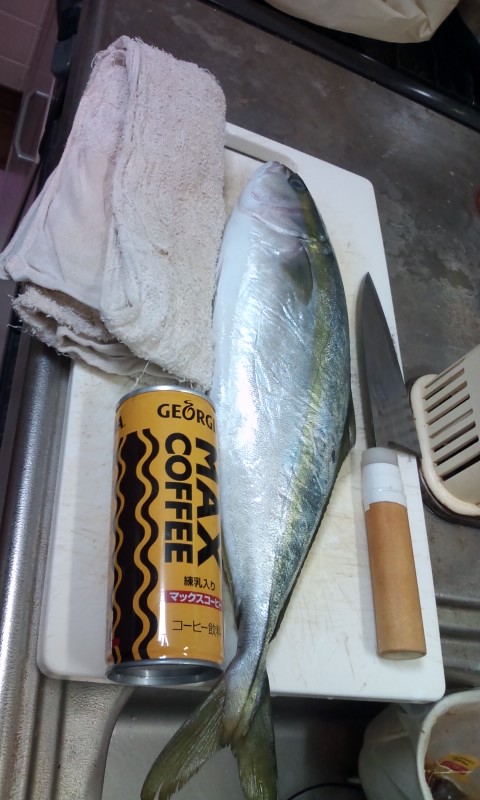 ブリは出世魚イナダは、関東の呼び方。関西ではハマチ?のお年頃だと思う。で、刺身はクセがなく美味しい。その辺にあったMAXコーヒーの缶と比べると、そんなに大きくない事がわかる。これで700円。三枚におろす。ちゃんと、心臓とかをバッサリいかないようにさばくと血がドバーッて出たりしない。皮向いて、柵にするお刺身にしてワサビ醤油で食べる。ワサビはチューブの練りワサビじゃ勿体無いから、自分で生のワサビ買ってきておろした方がいい。とまでは、言わないが、粉のワサビを練った方が、美味しいと思う。尾の身は、さすがに、お刺身ではスジ張ってしまって、食べづらいので、フライに。子供はフライが大好き。