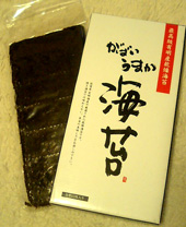 一時期懸賞にはまったりしてたんですが、最近はめっきりだったのに今日ポストに何か入ってました。 のり!最高級有明産乾燥海苔!と書いてあります。応募したことも全く覚えてませんが、何にせよ当たったのはウレシイw焼き海苔ではなくて乾燥海苔ってことで磯の香りがすごいです。。紫色・・・?そのまま食べてみると、普通の海苔と違ってジャキジャキした歯ごたえ。海草!!って感じです。香りもすごーーい。コンロあぶると海苔のいい香りが倍増!!色は深緑色になります。普段は焼き海苔を買うから自分であぶったりしないけど、焼きたてってこんなにも違うんですね。。。ちょこっとお醤油をつけて炊きたてご飯で頂きましたんーーーー。シンプルイズベスト!!がばいショップさん、ありがとうございました