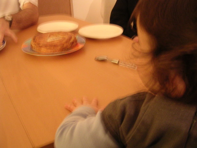 1月のフランスはガレット・デ・ロワ(Galette des rois)の季節です。東方の三博士(Trois Rois mages)がイエス・キリストを訪問した日を記念して、キリスト教では1月6日を公現祭(エピファニー)として祝います。現在フランスはクリスマスから2週間後の日曜日を公現祭としており、1月6日は祝日ではないため、この公現祭は6日前後に祝うという形をとっています。そしてこの日を記念して北フランス※で14世紀から始まっている習慣が、「王様を探せ!ゲーム(tirer les rois)」。※いつ頃からかは不明ですが現在はフランス全土に広まっている行事です。各自が切り分けられたお菓子を選び、中に隠されたフェーブ(かつてはソラマメが使われていたので、フランス語でそら豆を意味するこの名前で呼ばれる。現在は陶器でできたフィギュアが使われている)=「王様」に当たった人が、その日の王様もしくは女王様になれるというもの。こんな子供の遊びみたいなゲームですが、この季節になると大人同士でも結構みんな楽しんで食べていたりするフランス。(会社内でもおやつタイムに食べること多し)というのも、このお菓子そのものが美味しいからでしょう。そして公現祭に関わらず1月いっぱい食べられる(他の季節には見かけない)期間限定品なので、新年を迎えたらこれを食べるという習慣が定着しているのです。一番ポピュラーなのは、さくっとしたパイ生地の中にフランジパン(Frangipane、アーモンドクリームのこと)を挟んで焼いたガレット。それから南仏では伝統的にガレットではなく、ガトー・デ・ロワ(g?teau des rois)と呼ばれるブリオッシュ(卵とバターが多めのパン)生地にフルーツの砂糖漬けなどをのせて焼いたものが食べられているのだそうです。私はこの週末に上記2種類のほか、パイ生地の中に洋梨とチョコレートクリームが挟んであるものも食べました。どれも美味しかったけれど、やはりラム酒の効いたフランジパンが一番美味しい。そしてこの一番好きなガレットで、私は久しぶりにフェーブを当てました♪当たった人は、お店でガレットを買うと必ず付いてくる紙で出来た王冠を被るのがお約束になっています。マプッペは南仏スタイルのブリオッシュでできたガトー・デ・ロワを少し頂きました。こちらはりんごのコンポート入りで、子供達にも食べやすくてお薦めです。↑ブレていますが、テーブルの向こう側に写っているのがガレット・デ・ロワ。これは洋梨とチョコレートクリームが入ったパイ生地タイプのガレットこの週末は2件でお呼ばれだったのですが、2件ともガレットに併せてりんごの発泡酒、シードルが振舞われました。これがこの辺りの地域の特徴なのかどうか聞くのを忘れてしまったので、今度地元出身の友人に会った時にでも聞いてみます。◆◆◆◆◆◆◆◆◆◆◆◆◆◆◆◆◆◆◆◆◆◆◆◆◆◆◆◆◆◆◆◆◆◆◆◆◆そして7日は他にも日本の慣習である七草粥(もどき)も作りました。昨年はスズナ・スズシロのふた草でしたが、今年はなんと!スズナ(蕪)ひと草しか用意していませんでした(しかも野菜スープ用に準備しておいたもので、七草のことをほぼ忘れていた)。ひと草ではちょっと物足りなさ過ぎる、と試しに入れてみたのは・・・セロリ(汗)しかししかし、セロリも「セリ科」ということで七草の味に遠からず、かもしれません・・・(あれ、言い訳?)こちら七草粥は江戸時代になって一般に広まったものの、歴史としては平安時代から始まったものとか(当時は七草ではなく、七種の穀物だった)。と、二カ国の歴史ある食文化を堪能した週末でした。