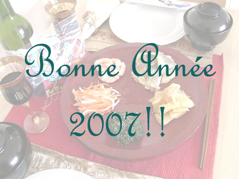 正月三が日が終わろうとしていますが・・・2007年、今年もどうぞよろしくお願いします。因みにこの正月膳な食卓は今年のものではなく、2年前の新婚時(爆)のものです。さて、大晦日は無事にオマールも調理し、20時過ぎにマプッペを寝かせてから友人達を迎え入れ、朝方3時過ぎまで延々と食卓についておりました。(ほんとよく喋る人達だこと)でも最後は健全に紅茶とチョコレートで締めくくったし、飲みすぎず食べ過ぎず、ちょうどいい摂取量だったと思います。そして肝心のオマール料理なんですが、なにせ初挑戦。日仏いろんな料理サイトで調理法を検索しながら何とか人に出せるものに仕上げました(iqcotさんすみません、写真撮り忘れました・・・)。しかし直前まで来る人数もはっきりしていなかった為、とりあえずオマールを一匹だけ用意しておいたものの、5人でオマール一匹(恥)は味見程度にしかなりません。しかも大食いが一人いることが分かっていたのでリゾットのお米の量を増やした関係上、肝心の海老味噌の味はあまり堪能できなかったような・・・ま、でも腐っても鯛ではなくオマール。サラダにして食べた身にしても、リゾット用にとったブイヨンにしても、普段食べている海老とは違ってとても芳香でした。どんな風に調理したか簡単に説明しますと、まずオマールを1-2分程下茹で。このあと身をはがして、今度は抜け殻を香味野菜(にんじんやセロリなど)と煮込んでブイヨンを作ります。そして炒めた玉ねぎとお米をこのブイヨンを使って鍋で炊き、最後に海老味噌と好みで生クリームを入れてリゾットを仕上げました。はがした身はまだ半生なので、これも好みでグリルしながら香りを出しつつ火を通します。一緒に食べるのがフランス人達だったので、ちょっと私には火が通り過ぎなくらいに調理してサラダにしました。身は恐ろしく縮んでしまいましたが・・・(涙)しまった、大晦日の食べ物の話ばかりで随分長くなってしまいました。年明けてからは電子年賀状の発送も始めています。今年は全員に一括で送るのをやめて、一人一人に短いメッセージをつけて送っています。(中にはグループ単位で送る人達もいます)当然ながら結構時間掛かっているので、まだ終わっていません。でもそうたくさん送るわけではないので、このくらいの労力は惜しまないで出来たらいいなと・・・来年はどうしているか分からないけれど←小声最後になりましたが、今年の抱負。今年は「言い訳をしない」を目標にしたいです。要は自分を甘やかさないというだけです。何でも完璧にするというのとも違うのだけど、何かにつけて出来ない理由を探さないように心がけようと。これも本当に実行できるのか?日記で言い訳していたら、どうぞ遠慮なくツッコミいれてくださいね!