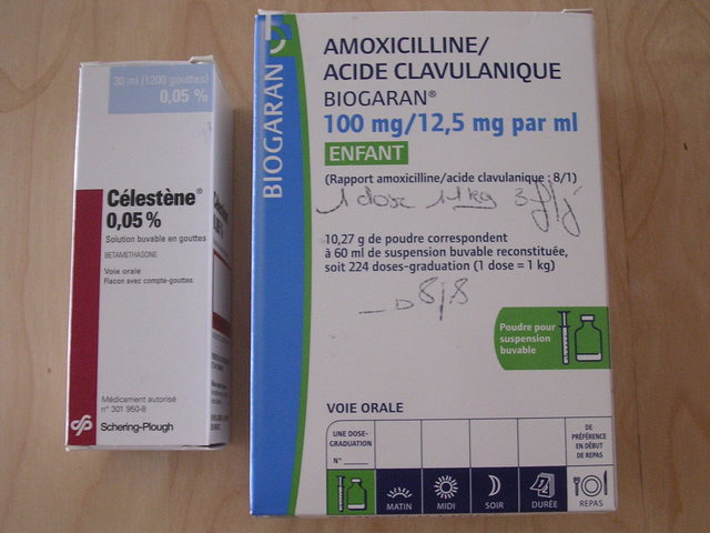(すぐに前回の続きを書くつもりだったのに、間が空いてしまって前回の日記が何とも切れ味の悪い終わり方をしていたことをお詫びします)火曜日に突風が吹くなか外出をしていたものの、当日は特に変わった様子のなかったマプッペ。しかし、日が経つにつれてだんだん風邪らしき兆候が出てきました。因みに土曜までの3日間の様子はこんな感じでした。◆翌日 水曜日寒さも突風もかなりのものだったので心配していたが、前の晩から朝までよく眠っていた。朝みると頬が赤くなっていたので、「突風に当たってしもやけになってしまったか」とカレンデュラ成分配合クリームを塗っておく。昼間は普段どおりに遊んでいて変化なし。ただ夜の寝つきが悪くなり、久しぶりに添い寝をしてそのまま朝まで様子をみることにする。夜中何度か起きていたが苦しんでいる様子はなく、隣で手を握っているとそのまま寝てくれた。◆2日目 木曜日食欲もあり、寝起きは元気だが、しばらく遊んでいるとだるそうな顔をする。鼻もでているし風邪を引いてしまったのだろう、とSerum(生理食塩水)で鼻を洗浄しておく。ベッドに入れると短い昼寝をたくさんする。お腹を壊した様子もなし。この時は風邪そのものよりも、頬の赤さのほうが気になっていた。歯がニョキニョキと伸びている時期なので、そのせいで頬が赤いのかとも思っていた(恥)夜はすんなり寝てくれたかと安心していたが、夜中になって泣き声で起こされ、結局添い寝、、するも上手くいかず、何故かベッドに横になりたがらない。抱っこすると機嫌がいいので、この時もあまり心配はしていなかった。・・・が。再び寝付いたかと思いきや、またもや隣で暴れているのに気づいて起きる。触ると熱があることに気づき、びっくりしてパジャマを脱がせて肌着1枚にし、ドリプラン(解熱剤)のシロップを拒否されながらも何とか飲ませて少し落ち着かせた。咳をよくしている。このあと少し寝て朝を迎える。◆3日目 金曜日マプッペにとってはじめての発熱だったので、小児科医に診てもらおうと連絡してみる。が、いつもの先生は研修中で留守との事。昼間は「元気な状態」とは言えないものの機嫌は悪くないし、食欲もあり他に変わった様子がないので、医者に行って他の病気をもらってきても困る・・・と代わりの先生の予約はとらなかった。「もしかして突発性発疹かも?」と、この場に及んでも呑気に自然治癒の方向で考えていた。この日素直に医者の所へ行っていたら、もうひと晩も苦しい思いをさせることはなかった・・・と後に猛反省することになる。夜になると昨夜よりも呼吸が荒く、喉がゼコゼコと鳴るようになってきた。この日も添い寝で乗り切ったが、横になると苦しいのかなかなか寝付こうとしなかった。そしてようやく翌日土曜日の朝に近所の掛かりつけの一般医に連絡をとって、同日昼の予約を取り付けました。そこでマプッペがLaryngiteに掛かっていると判明するわけです。Laryngiteは咽頭炎(いんとうえん)ですが、本人の年齢と症状からいって、急性咽頭炎(クループ症候群)と呼ばれているもののようです。このまま医者に行かなかったら呼吸困難になって救急病院に駆け込む可能性もありました。また、急性咽頭炎は殆どがウィルスによるものだそうですが、中には細菌性のものもあり、この場合は早めの処置が必要となります。今時はフランスの医者でも普通の風邪くらいでは抗生物質を出しませんが、今回は細菌性の疑いも考慮された上で、小児用の抗生物質と幼児用ステロイドが処方されました。左がステロイドで右がアモキシリン(抗生物質)しかし、抗生物質の威力はすごいです。これを飲ませて少し休ませただけで、すっかりと風邪っぽさの抜けた顔になりました。あぁ素晴らしき西洋医学。でもまだ咳がちょっと残っているので油断なりませんが。というわけで、今回は「素人判断で自然治癒を期待しすぎて医者行きが遅れたこと、子供が1歳を過ぎた途端に健康に関する慎重さが大分緩んでいたこと」をひたすら反省することになる、まだまだ未熟な母なのでした。