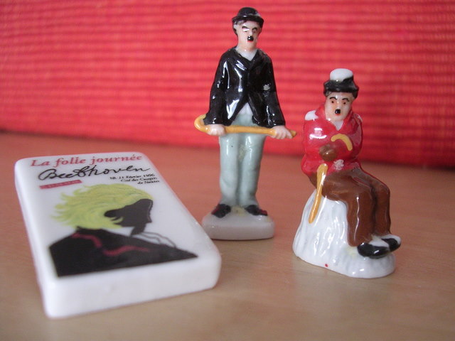 これも一種の食玩になるのかなということで、このテーマです。今季3回目になるガレット・デ・ロワ。1週目に2回食べたうち1度フェーブが当たり、2週目は友人宅で手作りのガレットをご馳走になったので、フェーブなし。この手作りガレットもフランジパンがふんわりしていて美味しかったです。そして3週目。これが食べ納めになるかもしれないと、フルット ガナ(Fl?te Gana 通常のバゲット、フランスパンの倍近い値段だが、それだけ出す価値のある細長いパン・・・ってこんな説明でいいんだろうか)が美味しい近所のパン屋でガレットを2種類(4人分を2つ)購入し、友人カップルを呼んで 結果的に今季最後となったガレット大会をしました。そしてまたもや私の元にフェーブが♪こんなところで1年分の運を使い果たしてしまっていたら困るなぁと照れつつも、最後に食べたガレットはどちらもとても美味しくて、さすがに今まで何を買ってもハズレたことのないパン屋の味でした。因みにひとつは御馴染みのフランジパン入りのパイ、もうひとつはガトーバスク(スペイン国境に近いフランス南西バスク地方のお菓子で、アーモンドプードルを使ったクッキー生地がベースになっている)タイプの生地の中に、ゼリーと飴の間のような質感のアプリコットジャムが挟まれたもの。このアプリコットジャムがくどくなくて、どっしりしたクッキー生地とも上手く合っていました。こちらが戦利品。左端が1週目に当たったフェーブで、ベートーヴェンの横顔を描いたもの。真ん中と右端はこの日に食べた近所のパン屋のガレット2つにそれぞれ入っていた、チャップリンのフィギュア。私が当たったのは右端の赤いシャツを着た座っているチャップリンの像。
