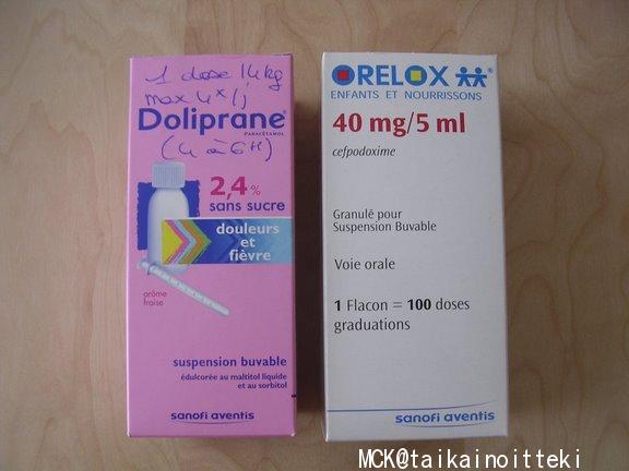 結局行ってきました、小児科へ。 →前日の様子この日は起きぬけの機嫌が良かったし、回復しているようには見えました(夜泣きは1度。その後特に問題なく朝まで熟睡)。が、一昨夜のお風呂場での震えがやっぱり気になったのと、これ以上長引かせたくなかったので小児科に予約を取ることに。幸い午前中の予約が取れたので、家の中で遊んでいたいと愚図るマプッペをなだめつつ出発。思い返せば健診以外で小児科に行くのは初めてでした(昨年の咽頭炎の時は近所の一般医に診てもらったので)。そして原因が分かりました。やっぱり医者に診てもらってよかったです。結果的に体の震えは、急に熱が上がったからだろうと(そのうえ温水シャワーを浴びてしまったしね)のことですが、熱性けいれんとは違うとか。けいれんの場合は意識が無くなるので、そんなもんじゃない!とキッパリ否定されました~確かに一瞬でも意識がなくなっていたら、すぐに病院へ行きますがね・・・じゃあ何だったのかというと、Otite(中耳炎、または耳炎の総称)集団生活が始まると、まず貰いやすい病気の筆頭に挙げられるのが、この中耳炎。それと1度かかると癖になりやすいとも。←これが恐怖ついにこの子もかかってしまったか・・・という気持ちを表しているのが本日のタイトルです。というわけで、お薬生活のはじまりはじまり~写真の右に写っているのが抗生物質ORELOX、1週間分処方されました。昨年咽頭炎をやった時はヨーグルトに薬を混ぜて誤魔化しつつ飲ませていたのですが、この薬は乳製品に混ぜると味が苦くなるので要注意。よって、夫と2人がかりでそのまま飲ませています(汗)写真左はお馴染みドリプラン(解熱剤)。もう熱はひいているので、今回あまりお世話になることはなさそうだけれども。影が入ってしまって見えにくい写真ですが、左の箱が喉の腫れ用に処方されたシロップMAXILASE(朝晩小匙1杯ずつ)と、右は鼻を洗浄する薬Pivalone。それにしても先週の鼻風邪からずっと抵抗力が弱っていて、いつ耳の中にウィルスが入り込んでもおかしくない状況だったんですね。日曜日の不機嫌&愚図りは既に耳が痛かったからなんだろうな~気づいてあげられなくてごめんよマプッペ・・・薬は処方された日数続けますが(でないと菌を退治できないので)、本人はもうケロリとしています。ギャルドリーの保育士さんは、「熱が37.5度を超えていなかったら連れてきてもいいですよ」ですって。そんなもんなのね。(といいつつ、翌日本当に連れて行ってしまいましたが・・・いつも通り楽しく遊んでいたようです)
