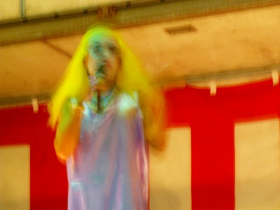 台風一過の晴天となった15日 一日順延で御浜ビアガーデンin JA撰果場が無事開催され、第一回から舞台を務めさせていただいている鬼城太鼓 今回も舞台を務めさせていただきました。 以下、一眼レフモドキカメラを手にした熊ちゃんのスピリチュアルな画像から・・・・今回の御浜ビアガーデンには、なんと「オーラの泉」で有名なあのミワさんが司会をされていました。 オーラでまくりで、画像が乱れておりますが、鬼城太鼓を紹介頂くミワさんの姿 ミワさんのオーラを受け、我が鬼城太鼓も 赤目になって、とてもスピリチュアルな演奏となりました。そして、遂に 白目となって、幽体離脱を始める マス ・・・会場の宙に浮いて、自分が演奏している姿を見ていたという うしろの百太郎もびっくりの マス の超スピリチュアルな幽体離脱体験を聞きながら・・・ 無事魂が肉体に戻り、泡立つバイオエタノールで かんぱ~~い おまけ・・・二度とないビッグな司会者と記念撮影。