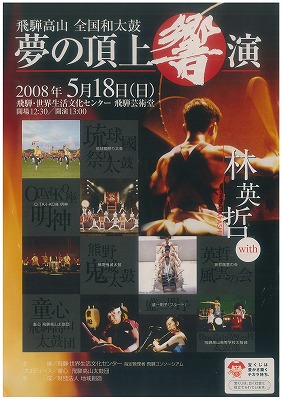 鬼城太鼓ブログ停滞原因 確信犯 久々の参戦です!!わたくしめがブログ書き込みサボりまくりで、業を煮やした ひろに~やん がブログ書き込み担当に目覚めてくれたのは、嬉しい限りで・・・「魔見島」大太鼓ポジションと共に、このまま世代交代しようかと思っとりますが、梅の収穫が始まり怒涛の忙しさとなる前に、ちょっくら参戦させて頂きます。5月18日飛騨高山 全国和太鼓 夢の頂上響演を見に来て頂いた友の会の皆さん。そして、このブログにコメント書き込みして頂いた夢の響演者の盛一明子さん。ほんとうに お疲れ様 ありがとうございました。盛一さんとはお話する機会もないまま、早々と高山ラーメンを喰って帰ってしまいましたが・・・自分達の出演前 舞台で着物姿でフルートを吹かれる盛一さんの音色に、緊張もほぐれ、落ち着いた気持ちで舞台に臨む事ができました。 有難うございました。舞台の内容的には反省点 多々ありますが・・・ 英哲さんの事務所からお声かけ頂き、皆さんと共に夢の頂上で打たせて頂いた事 ほんま嬉しく思っとります。以上 夢の頂上 響演 パンフレットより。・・・そして、すでに発表。 お江戸行きに雄たけび!!・・いやいや名乗り!をあげる友の会の友たちがすでにでておりますが・・・高山の英哲さんのコンサートで、英哲さんの口から「鬼城太鼓の連中も一緒に舞台に立ちます!」と言ってもらった、「人智千響」への出演。更なる夢の頂上が9月に待ってます。 自分自身仕事が「究極のどたばたファーマーズ」状態で、圧倒的な練習不足。 皆の足を引っ張らんように、高山の舞台も諦めようか思っとりましたが、やっぱり頂上を目指して頑張りたいと参戦させてもらいました。9月に待っている 更なる夢の頂上を目指しては、今度こそほんまに頑張らねばと思っとります。今年の目標は、 「有言実行!」 「ホラを吹かずにホラ貝を吹く!!」梅の収穫がひと段落するまで、どたばたしますが、 とにかく頑張ります!!宜しく!!夢を追い続ける限り、たどりついてホッとする頂上などないのかも知れません。