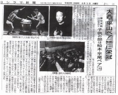 報告が遅くなり大変申し訳ありませんでした!6月1日(日)熊野市民会館大ホールにて午後2時より響鼓in熊野リレーショナルイベント 第3回「寄せ太鼓コンテスト」が開催され、大勢の和太鼓ファンが集まり、寄席太鼓の競演を楽しみました。並みいる強豪を抑え大西・平山ペアが見事優勝!!この日初めて寄せ太鼓コンテストを拝見させて頂きましたが大西・平山の息のあった演奏はまったく素晴らしく(音、タメ、ノリ、間、その他言い尽くせない・・・一点のミスも感じられない究極の即興演奏)演奏中に思わず掛け声を掛けてしまい、前にいる観衆に睨み付けられました。つま先からバチ先まで全身全霊を込め、一音一音に魂が込められ、その表情までも最高のパフォーマンスとして堪能させて頂きました。時に笑いあり、また師匠を思わせる仕草等『これぞ和太鼓っ!』の舞台に久しぶりに涙が出るほど感動させて頂きました。まったく同じ鬼城太鼓の仲間として嬉しく誇らしい限りです。くまどこの記事より『優勝した大西、平山ペアの太鼓は、寄席太鼓ならではの人を引きつける演出、そして演奏、見て聞いているものが、自然と溶け込んでいくような和太鼓の演奏が評価されました。』優勝の二人にはトロフィーと賞状と京都旅行(二人分)が贈られました。『おめでとー、二人はえらいっ』京都旅行は大西より新婚の平山夫妻にプレゼントされました。(たしか?)『ひらくちゃん、えらいっ』パソコンが変わって写真の掲載方法がわからず・・・・ご報告が遅れましたことを平に、お詫び申し上げます。よいお年をっ!