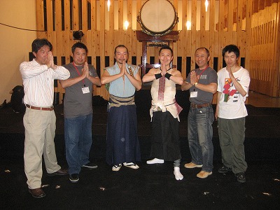 先日の『鼓童』では久しぶりに和太鼓を感じさせて頂き『参りました』と言うほど圧倒されました。一曲目から涙が出そうになり相当ヤバカッタです・・・鬼城メンバーもコンサートの後『もっと練習せんといかん』と今の自分たちの状況を反省しました。とにかく『鼓童』は素晴らしい!!また鼓童自身も『新宮公演は特に思いいれがある』と言っておりました。新宮公演主催者のお陰でほんまにいいものを見せて頂き感謝しております。見臺さん『いっつもおおきにっ』それから友の会の皆様(くまちゃん、ニャージ、女将、智得ちゃん)この度は大変お世話になりありがとうございました。搬入から搬出、飲み会までお手伝いいただき、飲み会でも圧倒的な存在感を放っており・・・ついに私の出る幕はございませんでした・・・ディープな夜でした・・・・・・もう何も言えません・・・以下友の会本部長『くまちゃん』から『鼓童』新宮公演関連(飲み会?)の写真をいただきました!!おおきにっ!1コンサート前日の飲み会の様子飲み会終了 鼓童による『木遣』コンサート終了後(新宮出発前)記念写真 皆さんほんまにありがとう!よいお年をっ!