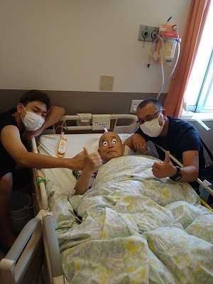 病室でのひとコマしげさん曰く、『頭がこんがらがって』再入院となりました。以前にもまして言葉が汲みにくいんだけど、『看護婦さんのおっぱいプルプル』はスラスラ言えた謎の病。ナゼ(-_-;)左手は麻痺してますがお腹はプルンプルン右手は自由なので、食事やテレビのリモコンは操れるとの事。手術するかはこれから判断するようで、まずは検査と様子見の様でした。この期に及んでまだ釣りに行く計画をしているようで、病室に入るなり若くて可愛くておっぱいプルプルの看護婦さんから『釣り友達ですか?』って聞かれましたwいま釣りに行っても暑さで溶けちゃうから、まずは体を整えておくれ!