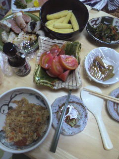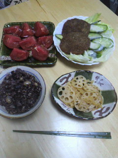 古代米とひじきと大豆の炊き込みご飯、竹の子と鶏の煮物、豚の角煮、胡瓜とワラビの酢の物、トマト。 なんか、いいな~♪ しみじみマイウ~。 (*^-')b