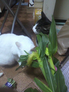 産直市場で買ってきたスイートコーンの葉っぱにかぶりつくうちの猫たち。 猫草とかマタタビの仲間なんやろか?