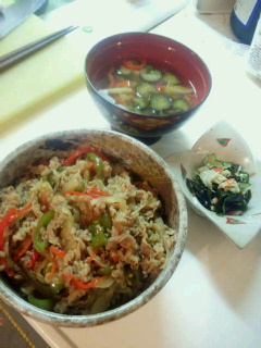 じわじわ夏の疲れが出始めているので、ガツンとスタミナつけようと、特売で買ってきた牛バラ肉と沼田で買ってきたピーマンと青とうがらし(福耳)と熟して赤くなった福耳、たまねぎで、「夏牛丼」を。 茄子と赤福耳で夏味噌汁に、きゅうりとカニかまとわかめの酢の物。赤と緑の色彩が夏らしい・・・?なんか、そう言えば久しぶりにマトモな夕食かも???しかし、最近は豚肉ばっかだったから、牛バラとは言え、牛肉美味いな~。。:゚(。ノω\。)゚・。(感激)たまねぎの甘さと、青とうがらしの辛さがピリッと後ひく美味さ。箸が止まりません!!ついでに、汗が止まりません!!ヽ(・∀・)ノ ワチョーイ♪