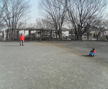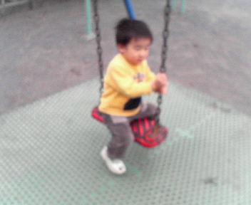 やっと日が出てきて、明るくなってきました!!まだまだ風邪っぴき ですが、ネット見出したらヤメられず。。ところで、水曜の休日は、パパも風邪でダウンしてしまい、私も風邪、チビ子は鼻水ズルズルと大変でした。。。。が、チビ太は鼻水出てるも、 元気イッパイ一応『公園で遊ぶ?』と利いてみると、『行く~!!』とのこと私と二人で、近所の公園へGOこんなふうにブランコ乗ってみたり、、またコンビカーに砂かけてみたり、、この日も寒さに負けず、元気なチビ太でありました。。