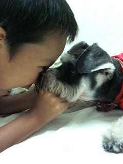 家の長男とペットのシュナウザーのこゆきちゃん・・・ほんまに仲良しやねん・・あんまり可愛いのでシャメしました。ねっ、仲良いでしょ♪