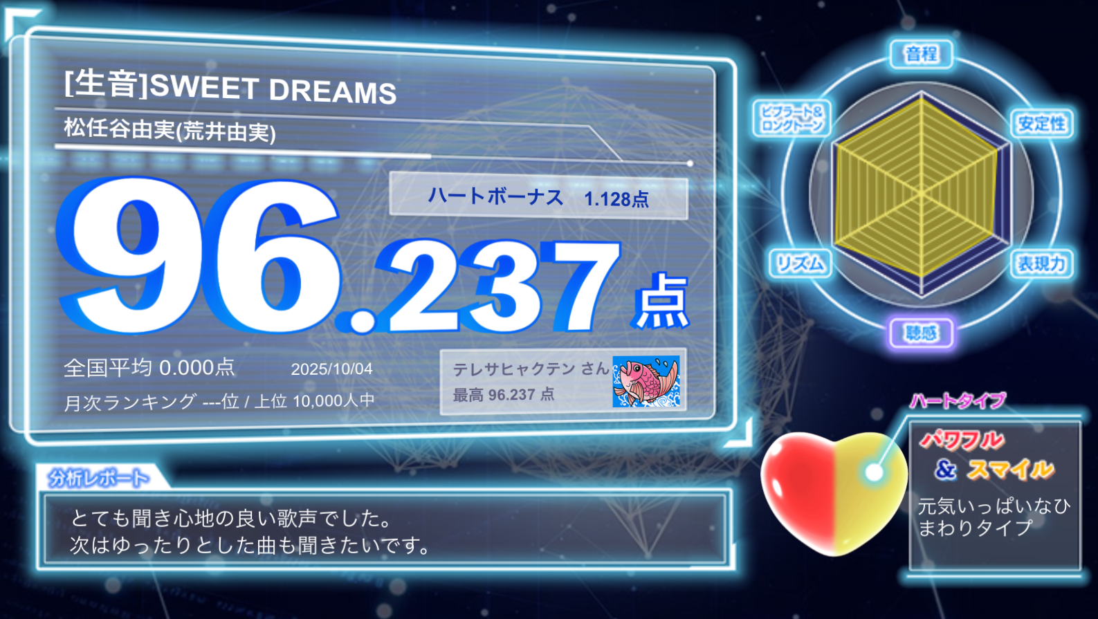 251004かなり久々に常連部屋でない部屋だったので、調子がいいです。音の響きが違う。251005今日は常連部屋なので点数は諦めました…。顔面偏差値は高いし(特にたぬき顔の娘はかわゆい)、曲も悪くないのですが、イマイチ売れてないアイドルグループの歌を歌いました。10月度の5日目なのに3人しか歌ってないので人気は全然ない。倍倍やだめですかの歌詞のような『できないことよりもできることを数えてみようよ』『写メは写メは自撮りが盛れるの』のような心に刺さる歌詞がないからかも。かわいい+心に刺さる歌詞が最近のヒット曲の理由のひとつだと思います。251012かなり久々に歌ったのですが、そこそこ上手い点数を取れました。実はこの日も常連部屋ではなかったのです。受付に近い部屋だったのですが、気にせず熱唱しました。アッコさんの抱擁をAiHeartになって初めて歌った時、異様に低い点数だったので恐怖で歌っていなかったのですが、AiHeartが良い歌と判断していると思われる聞き心地が良い歌い方を少し意識して歌い、そこそこ上手い点数を取れました。アイナ・ジ・エンドの革命道中は点数はともかく全国順位は高めです。ボカロに順応しているからでしょう。あまり履歴でボカロは見かけないので、多くの人はボカロに慣れていないと思われます。ボカロを歌いまくっている私に一日の長があると思われます。251018常連部屋なので大画面で本人歌唱動画視聴メインです。去年の紅白出場バンドの新曲を1クール遅れで歌いました。251019常連部屋だったので新曲の練習をしました。朝ドラ主題歌は男女混成歌唱なんですが、頻繁に入れ替わるのでスローな割に難しい。ガチ勢が多いAiHeartでも平均点が85点なのがそれを裏付けている。私は男女どちらの音域もいけるのですが、切り替えるのが難しいので、諦めて男性と女性の中間の声域に固定して歌うことにしました。251027安定の常連部屋です。明らかにこの部屋にしたい理由があるのでしょう。CANDY TUNEの紅白出場は確定でしょうが、ダメ押しで応援歌唱しました。アイナ・ジ・エンドも紅白出場確定でしょう。参加者3000人越えなので、ガチ勢以外も多数歌っている人気曲のようです。LiSAも久々に紅白に出れる可能性はありますが、LiSAの新曲ならもっと参加者が多くても良さそう。劇場版の主題歌だからテレビ版に比べると知られていないと思われます。ぜひ紅白で聞きたいので、常連部屋でもそこそこ上手い点数を取っておきたい。