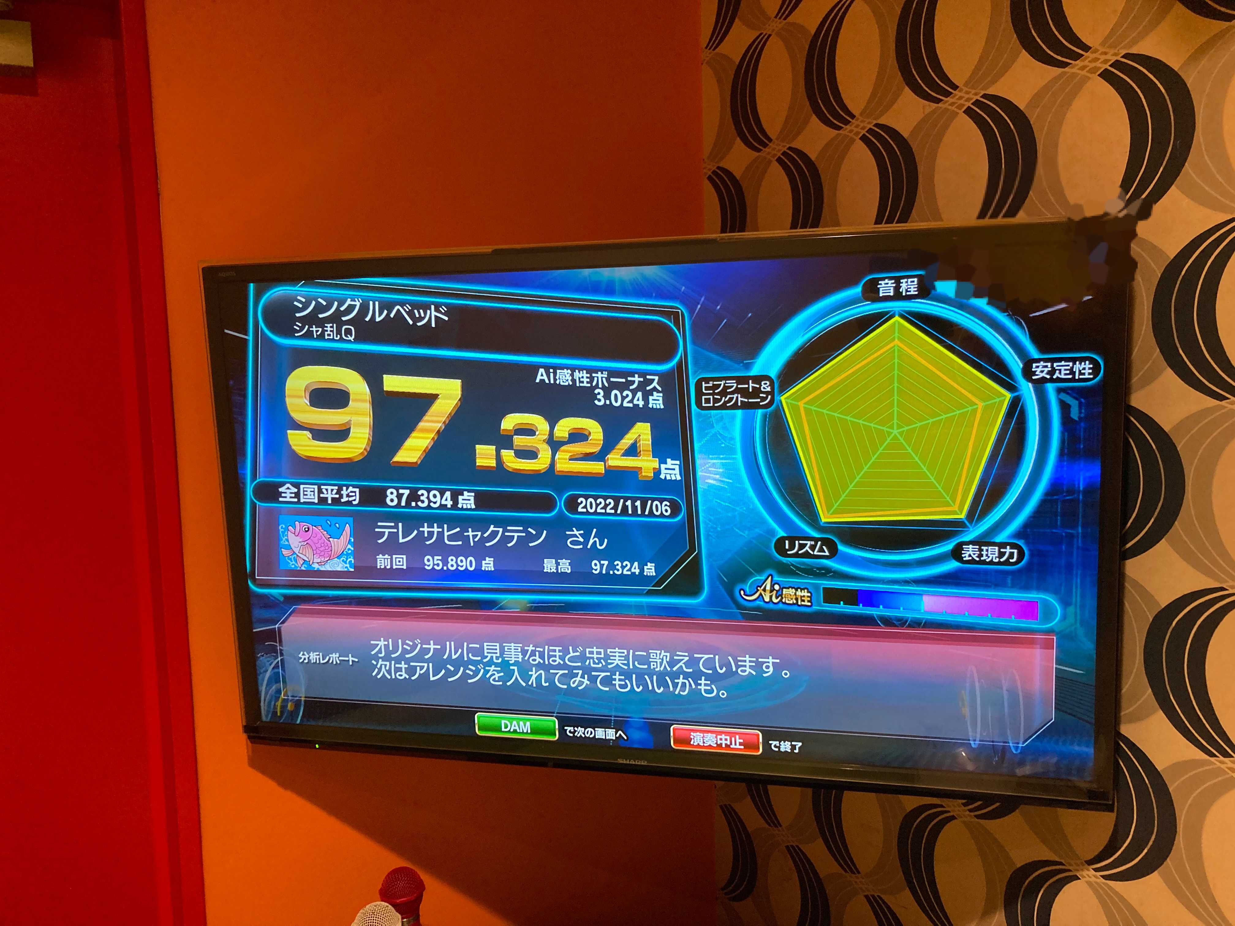 体調を万全に整えることを心がける。221105-221006あまり歌わない曲でしたが、95点の履歴があったので置いて行かれないように歌ったら普通の点数を取れました。普段から歌ってないので仕方ないですが、むしろ遅すぎました。この曲はAiでは有利と言われてたので。普通の点数のみです。イマイチです。今はYOASOBIの『祝福』をうまく歌いたいので他の歌はどうでもよくなっている感はあります。ただ、どうでも良くても体の調子が良ければ普通じゃない点数も取れます。再来週にまた悶絶整体を受けるので、今度はフルパワーでやっていただき、普通じゃない点数を取れる身体にしてもらいたいです。221112-221113『祝福』でなんとか90点を取れました。3日かかった…。『怪物』に比べれば転調はないが、音の変化が大きく、速くて難しい。音程正確率を高めたい。あとはいつものです。221118-221120悶絶整体を受けて快調だった。でも点数は普通の点数を取れたぐらいだったので報告するまでもないと考えて報告しなかった。221126今週は比較的よく寝れた方で、調子はまあまあ良かったと思う。夜ふかしをしなければなお良い。普通の点数ですが、気持ちよく歌えました。221127夜更かししてバイオリズムが乱れていましたが、締め曲で普通の点数を取れてまずまずです。