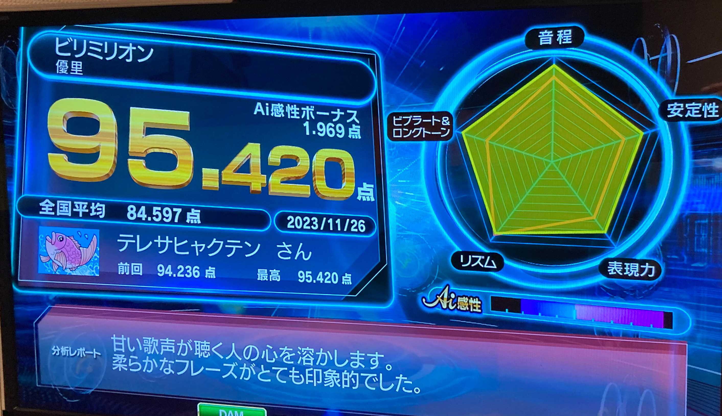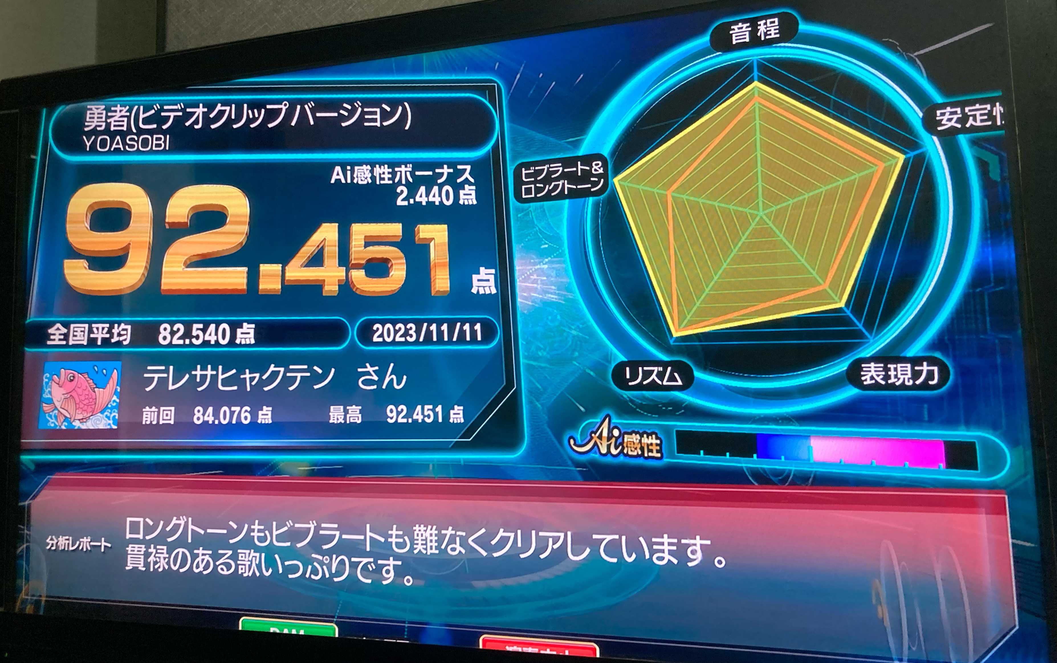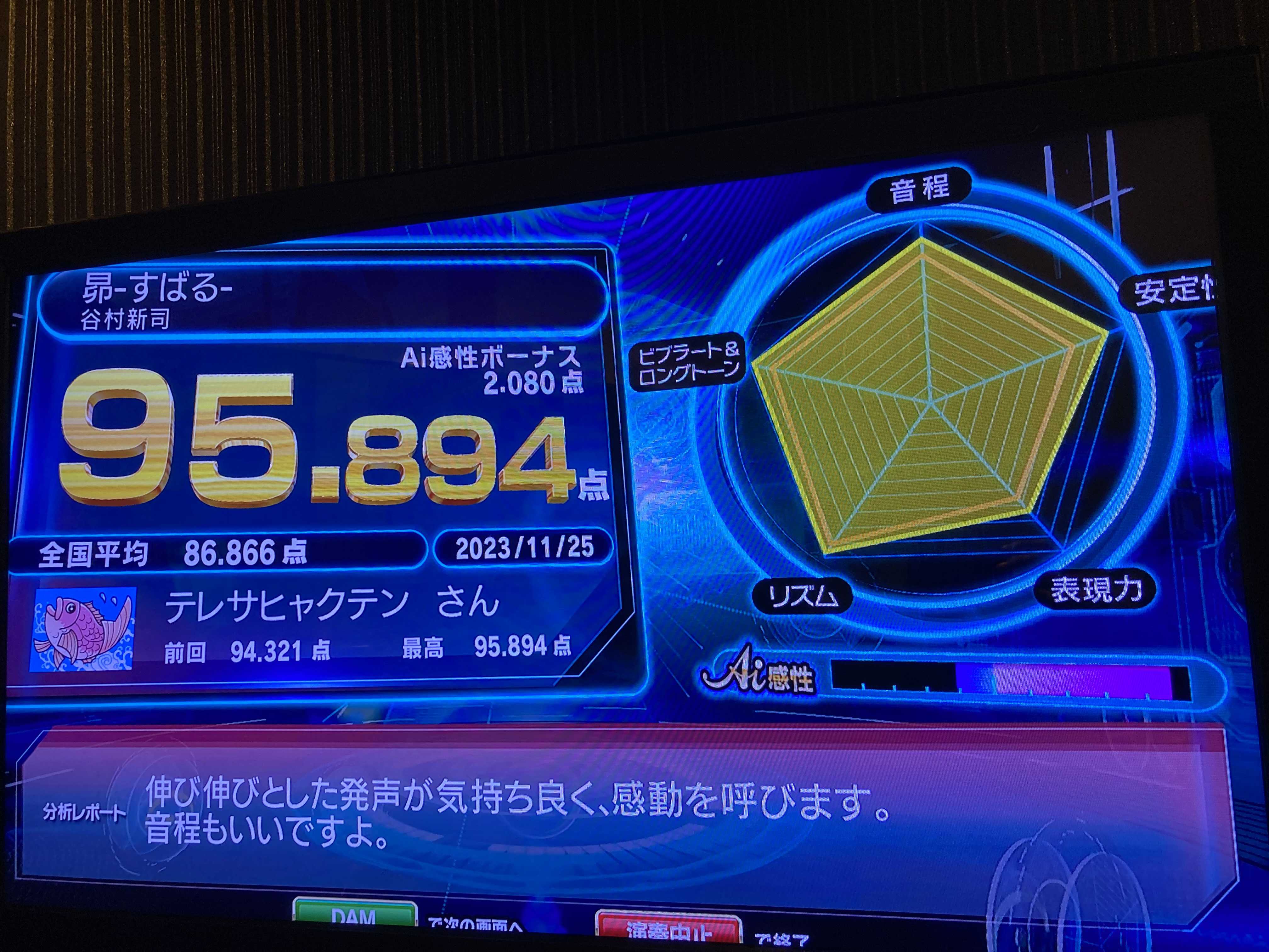 今月は喉が治りきらないまま、歌い続けていたので安定性が悪く普通の点数が出にくかったのですが、最後になんとか取れました。