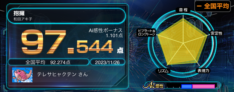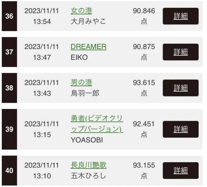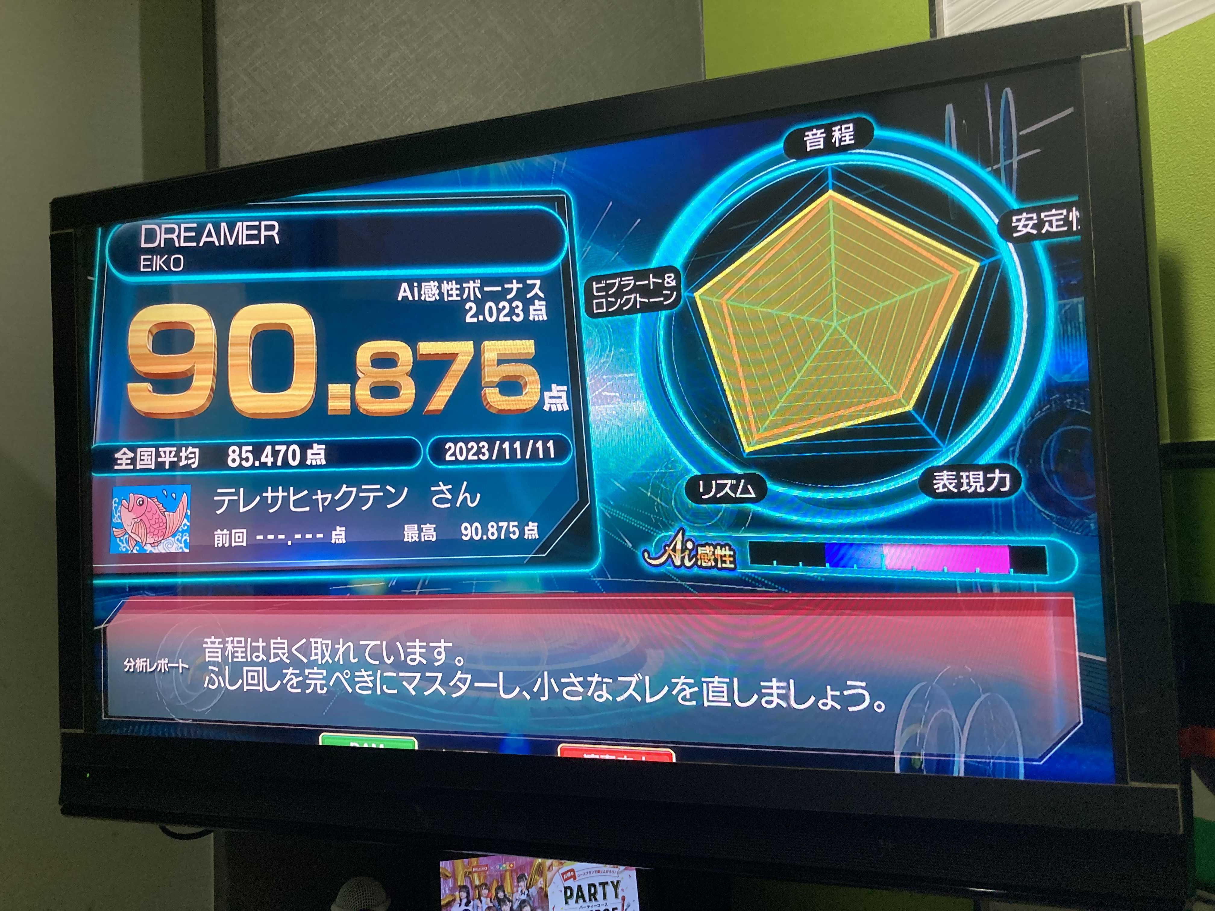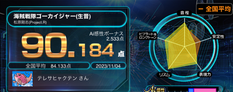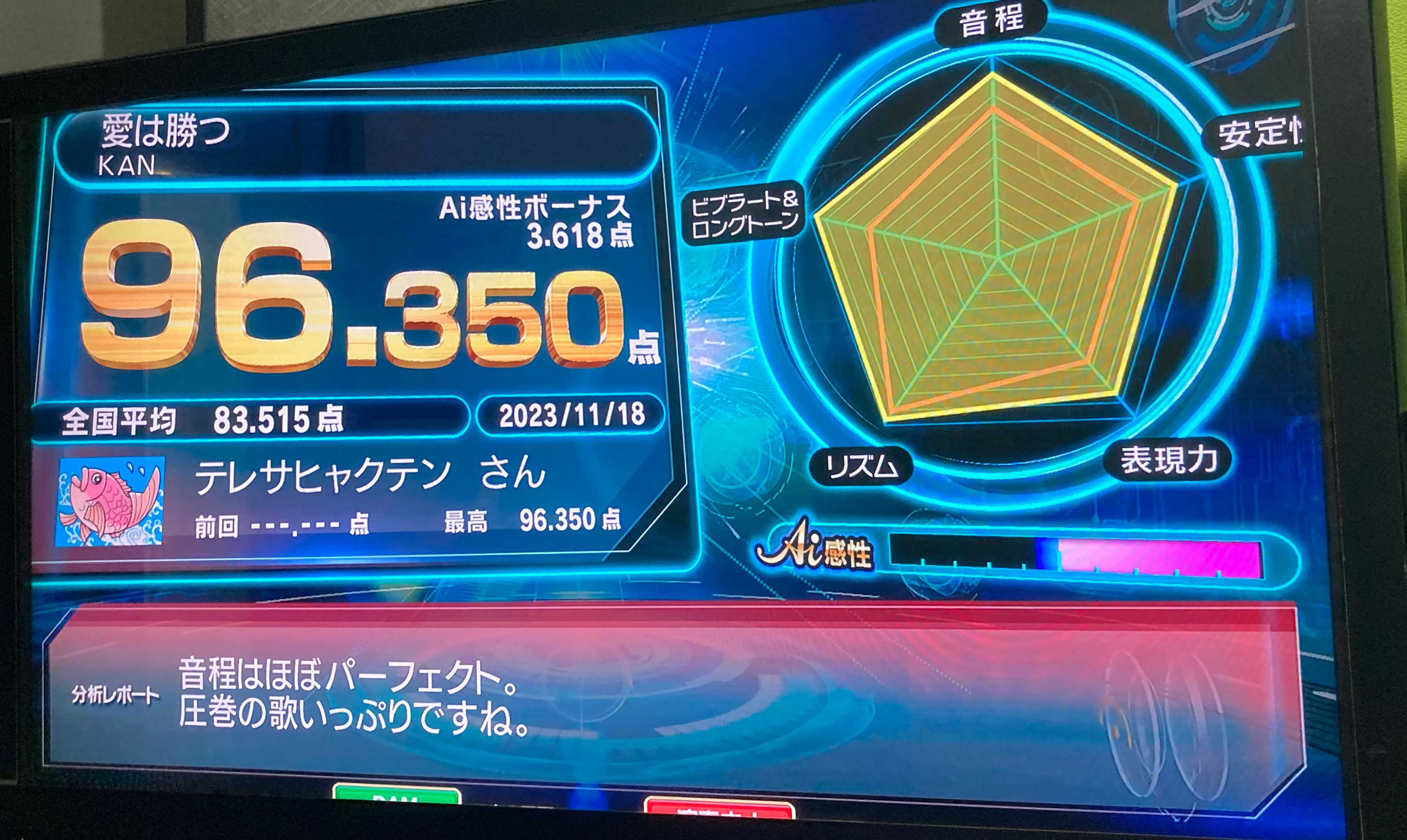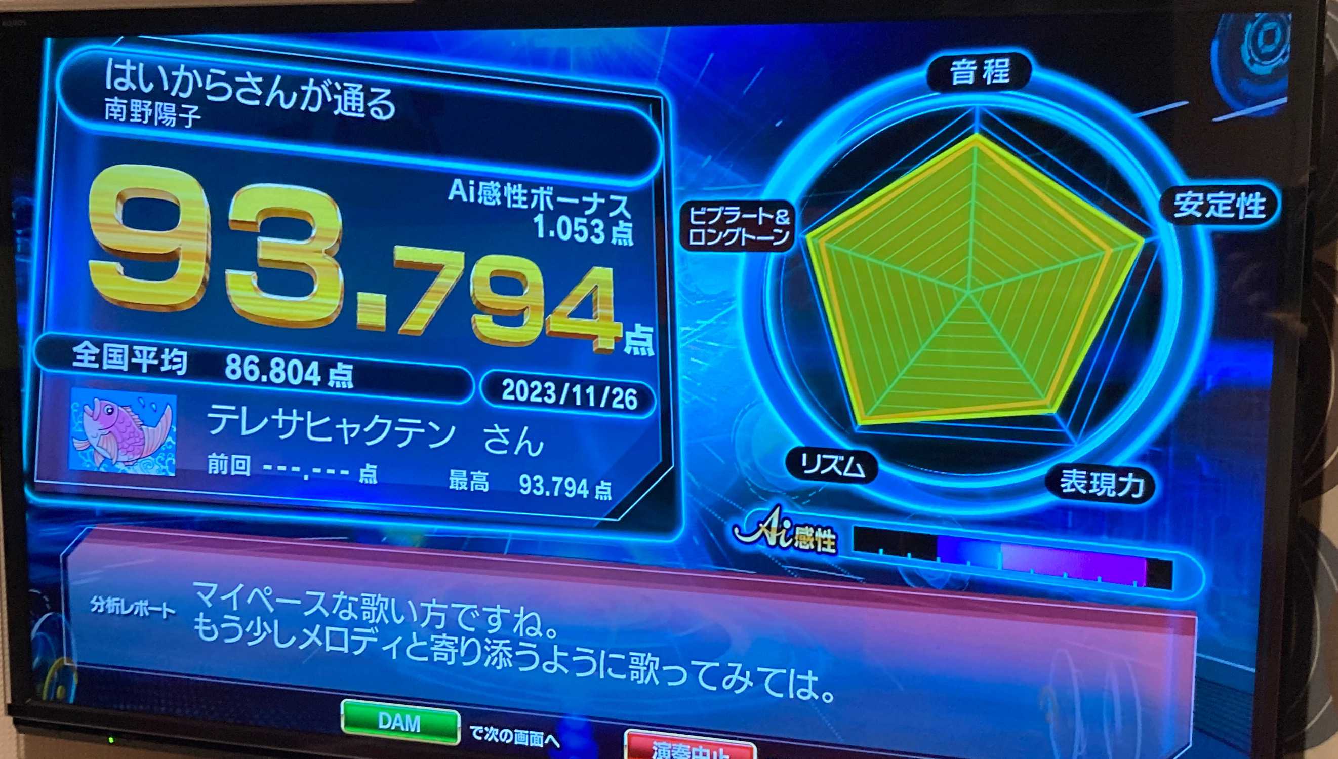 今月は喉が治りきらないまま、歌い続けていたので安定性が悪く普通の点数が出にくかったのですが、最後になんとか取れました。