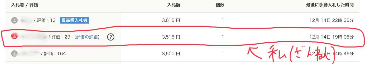 もし、3500円で入札していたら、3500円で入札していた人の方が早いので負けていました。