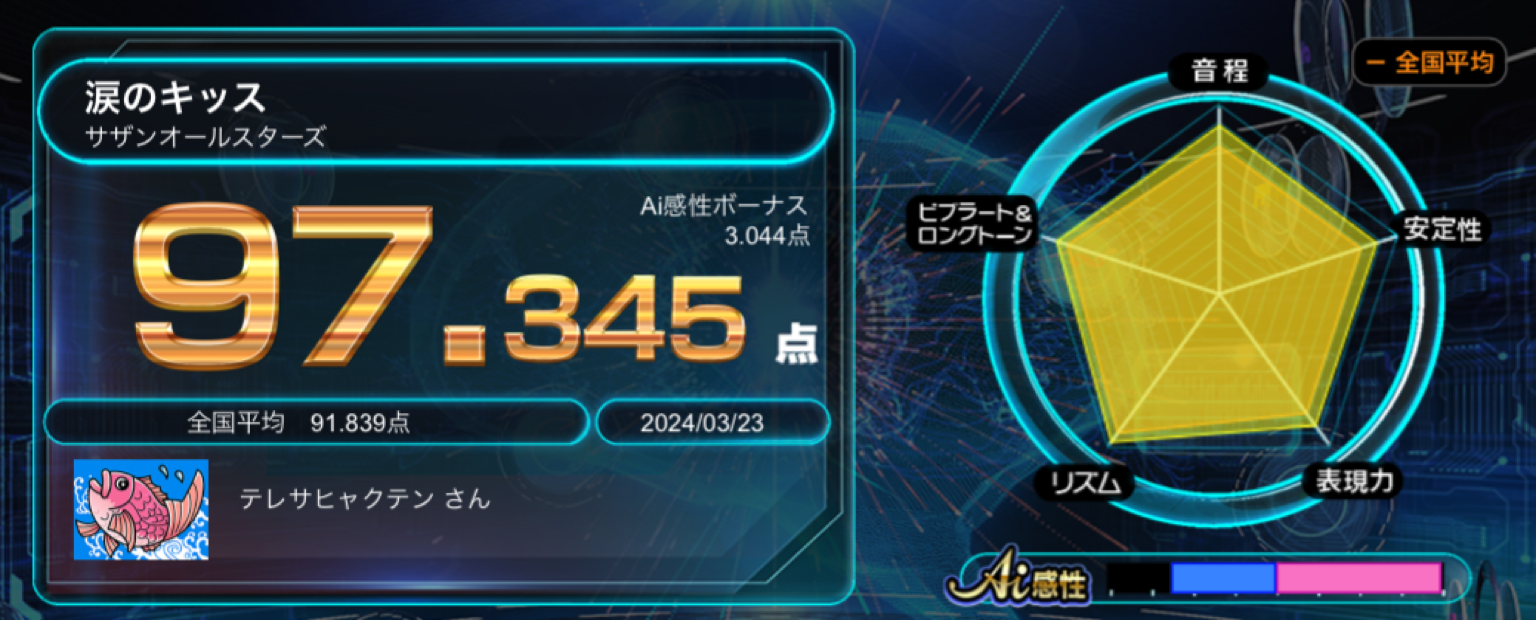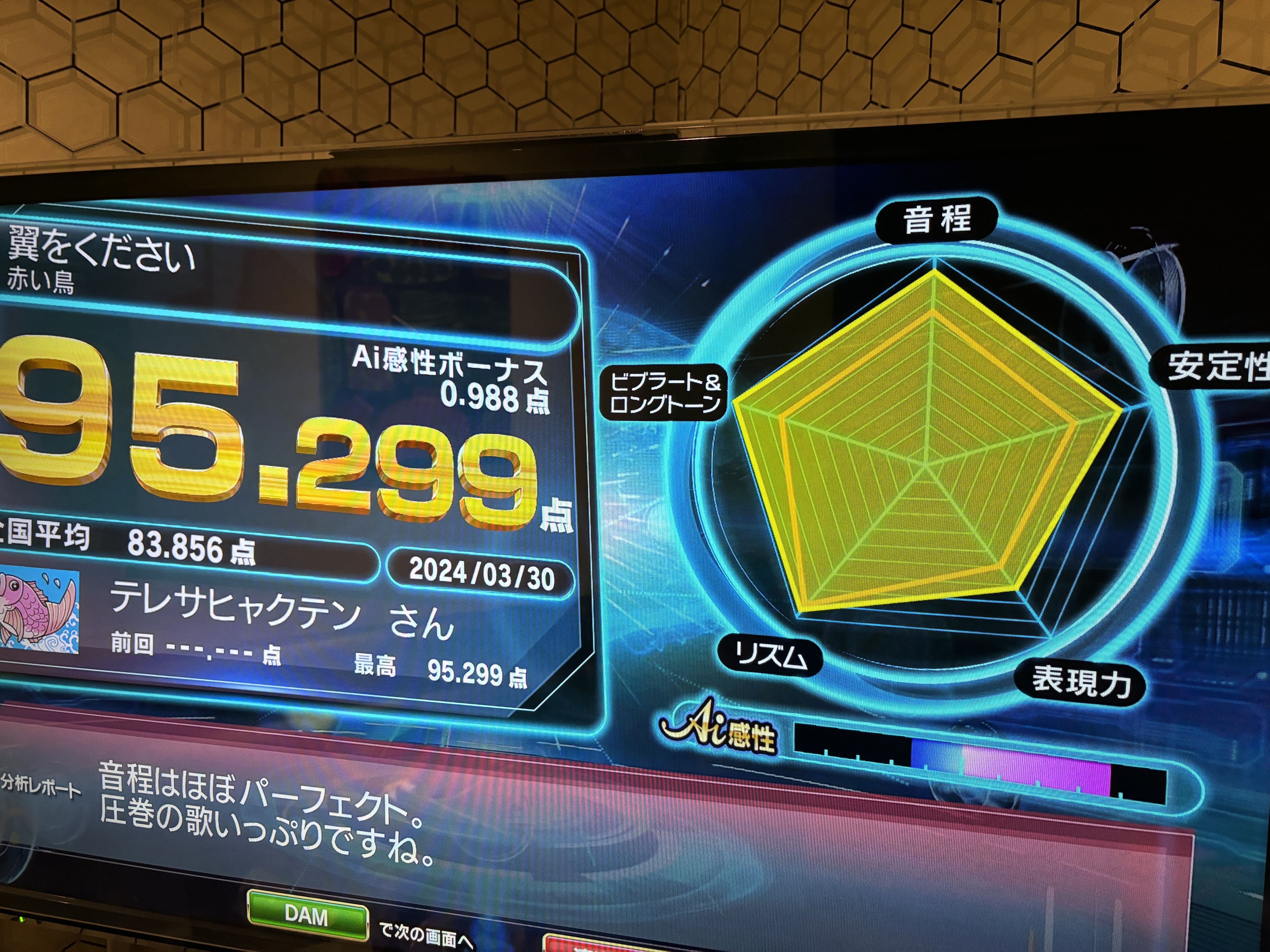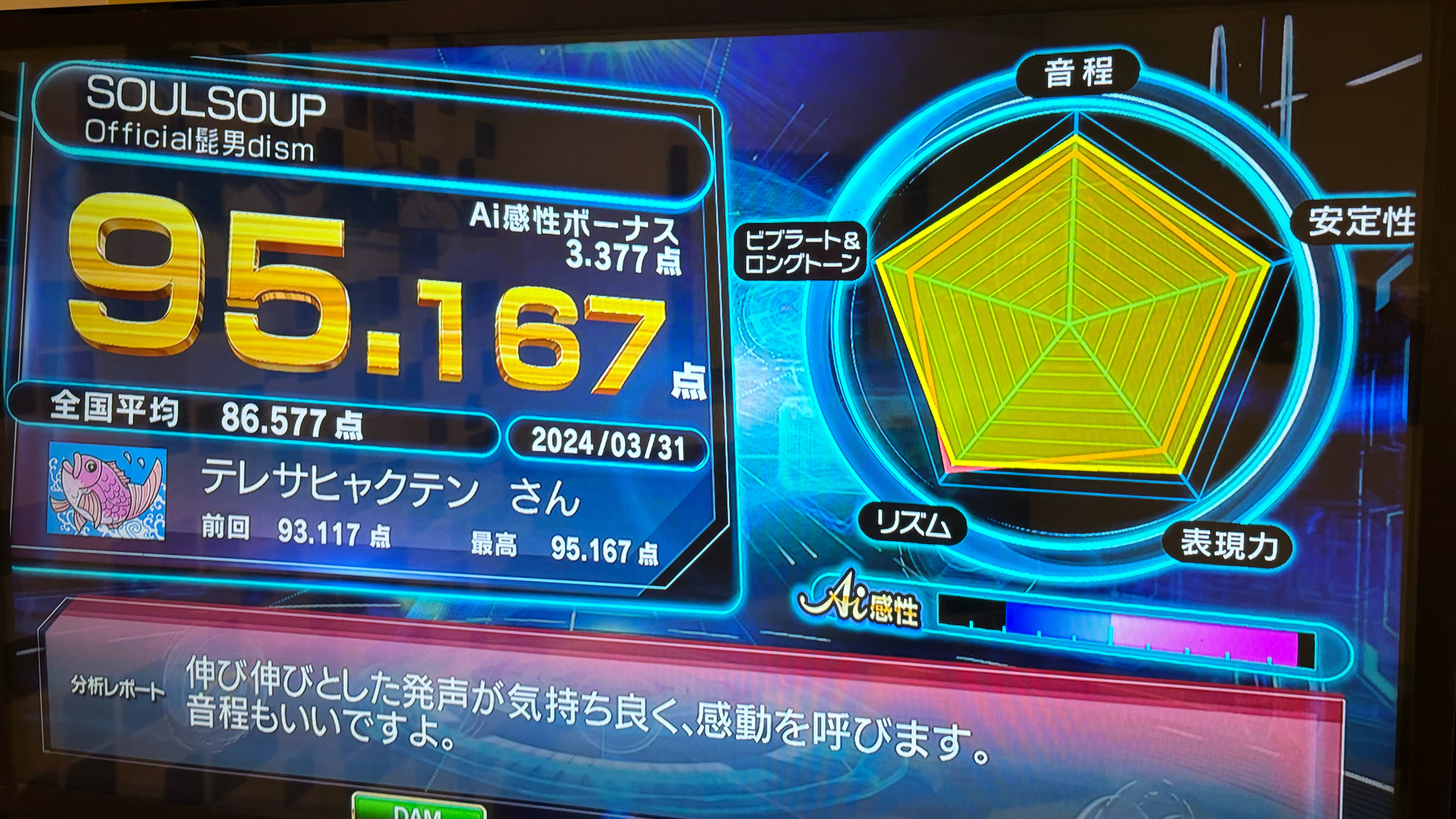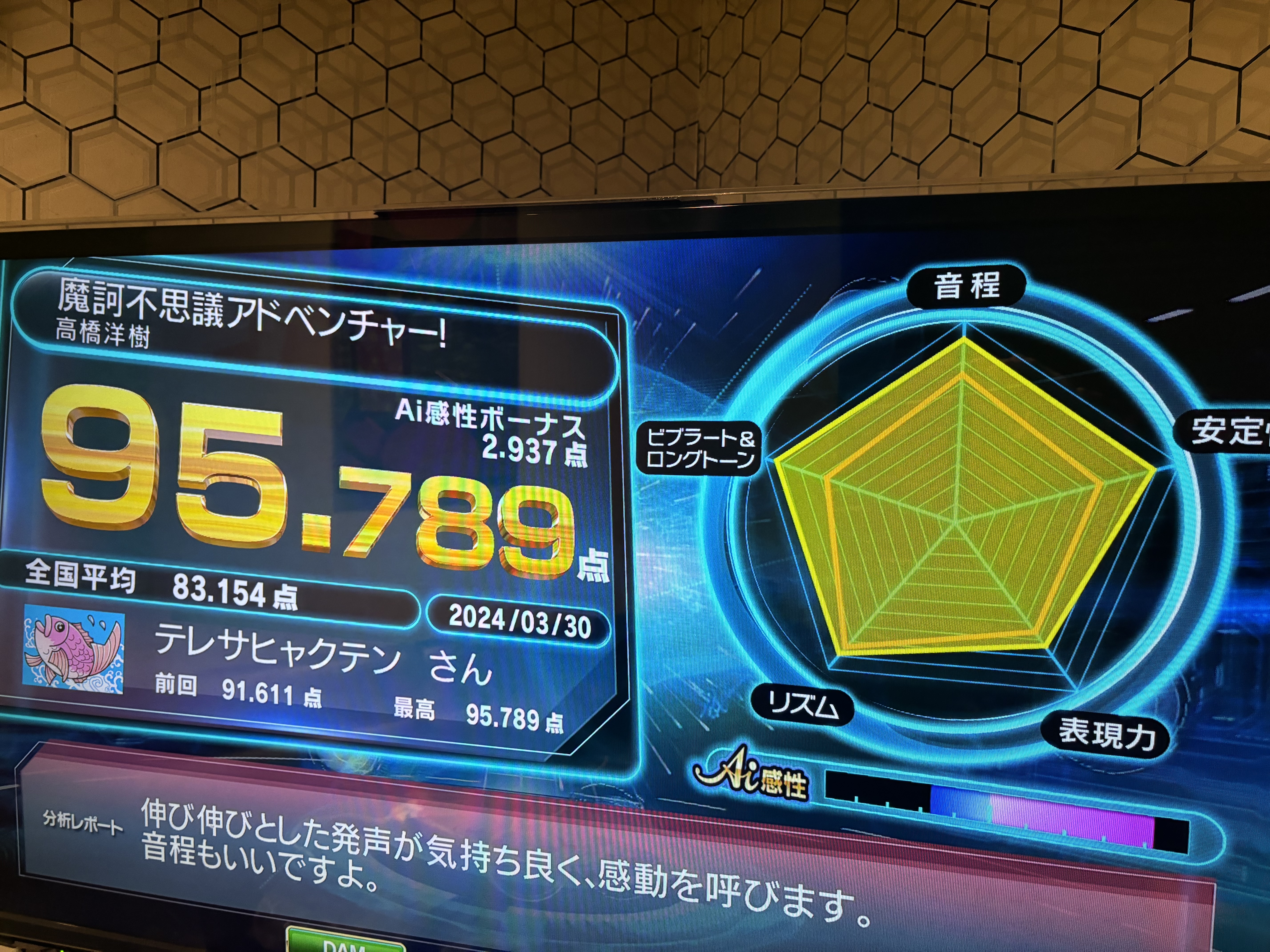 普通の点数は1曲だけです。サウナにまた行くようになってから鼻からの息の吸い込みが楽になってきています。