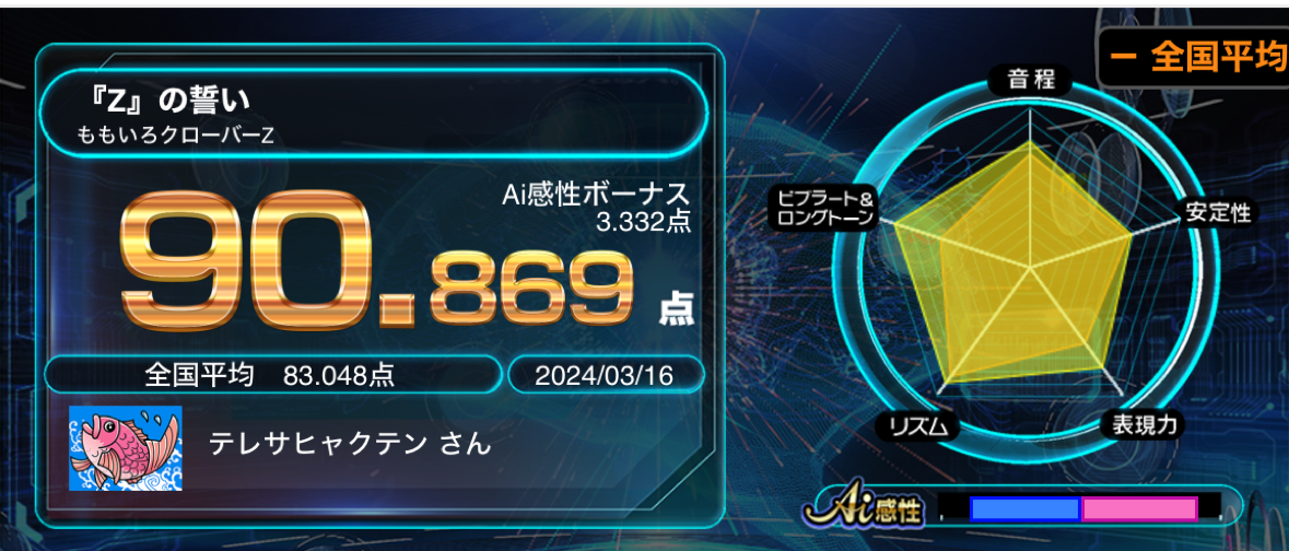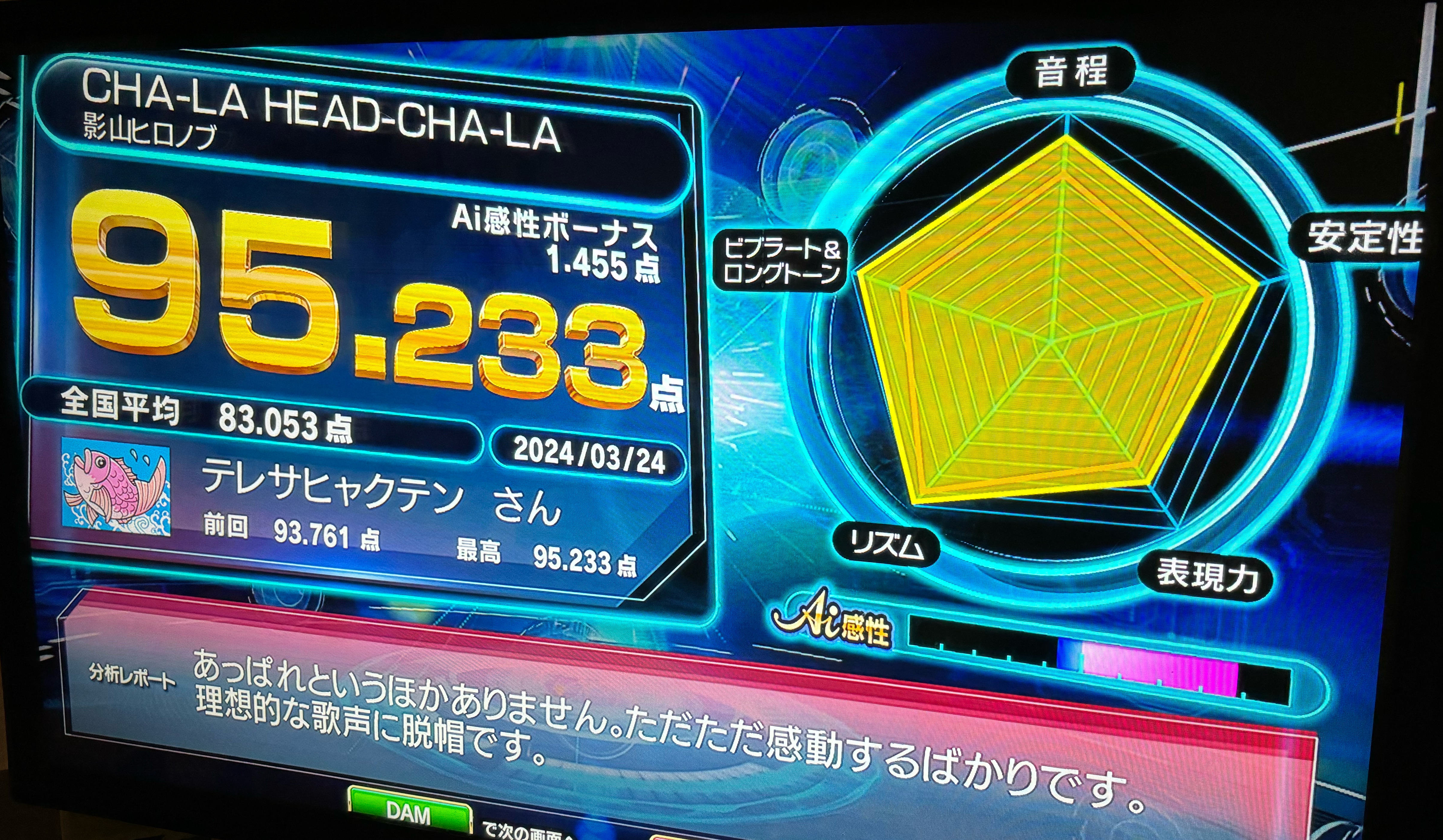 CHA-LA HEAD-CHA-LAでそこそこ上手い点数を取れたので、胸がパチパチするほど成仏Sparking!していただけるものと思います⁉️