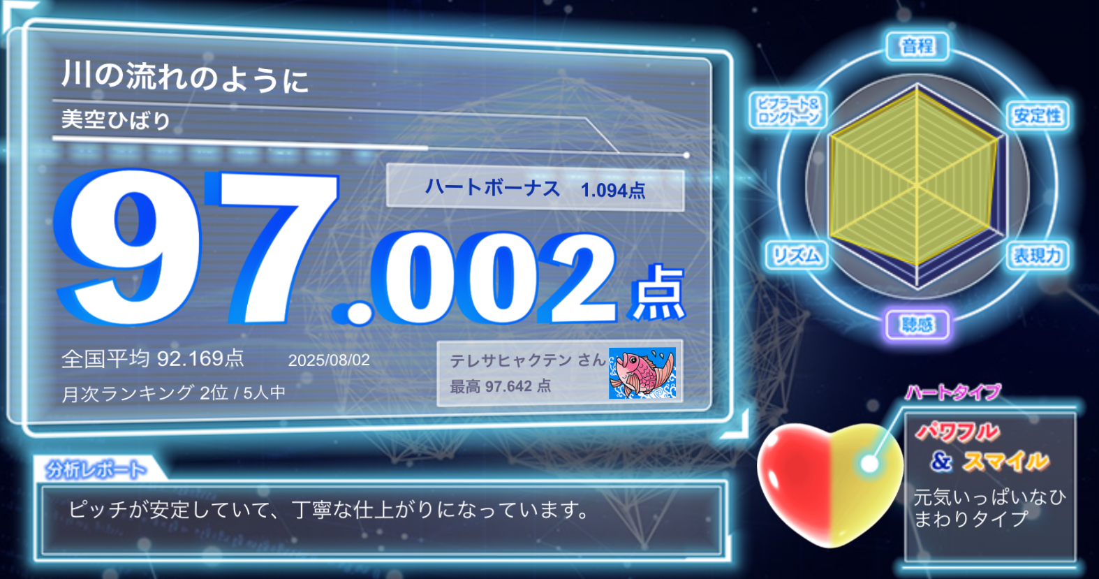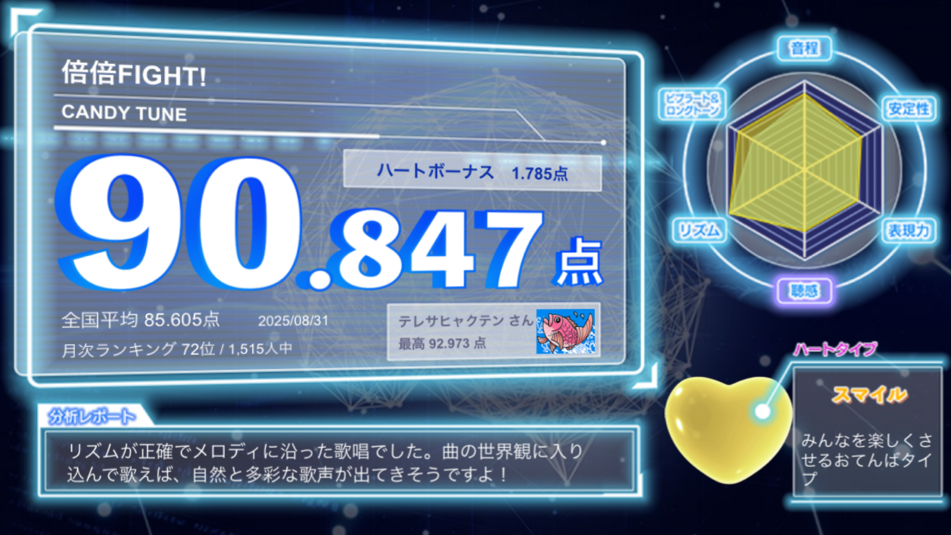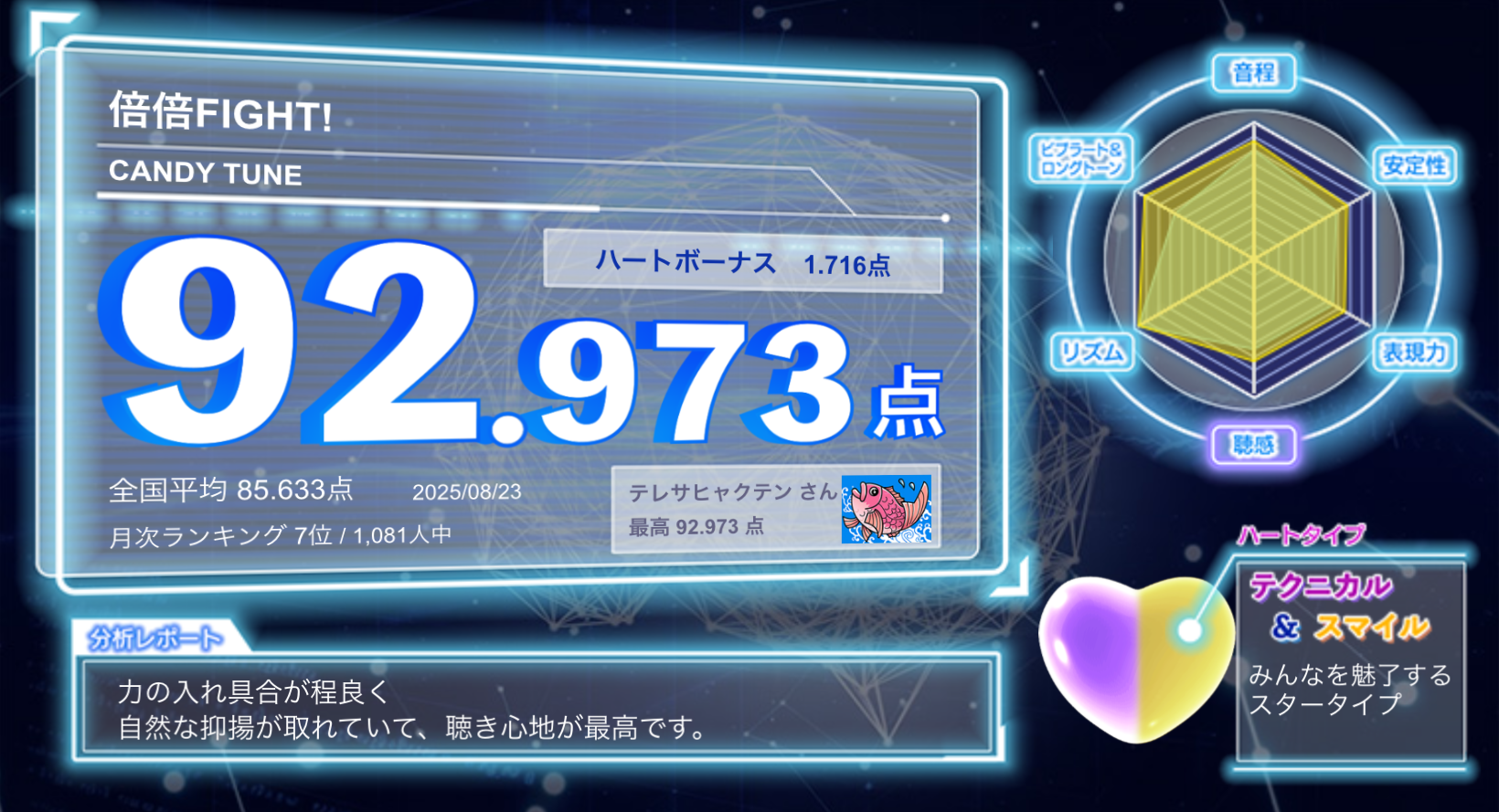 ポテンシャルパワーが発動して難しめの曲でも点数が高めです。