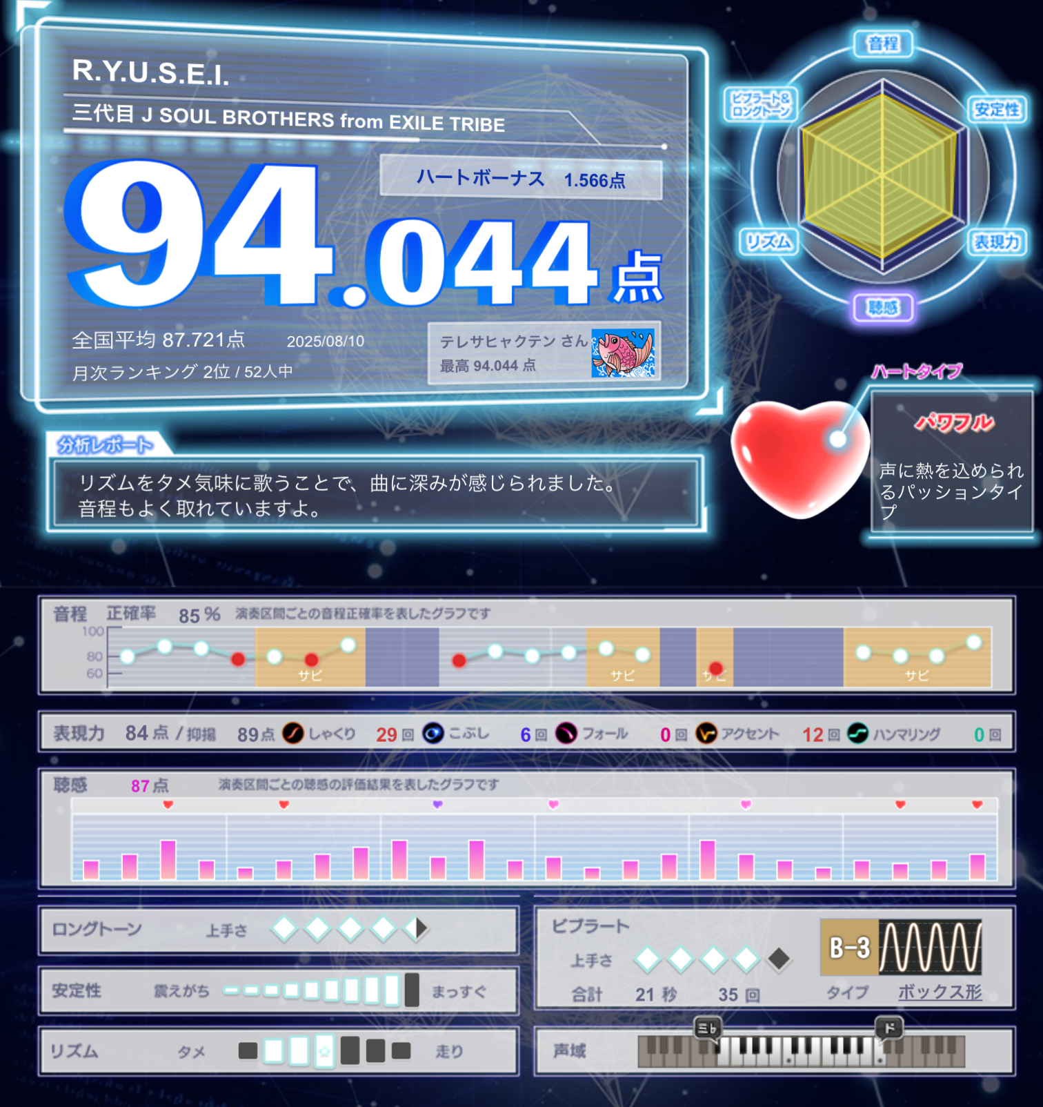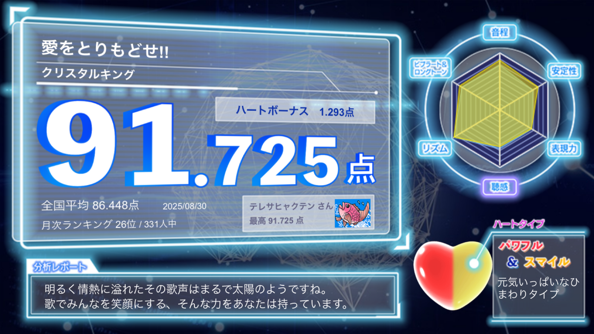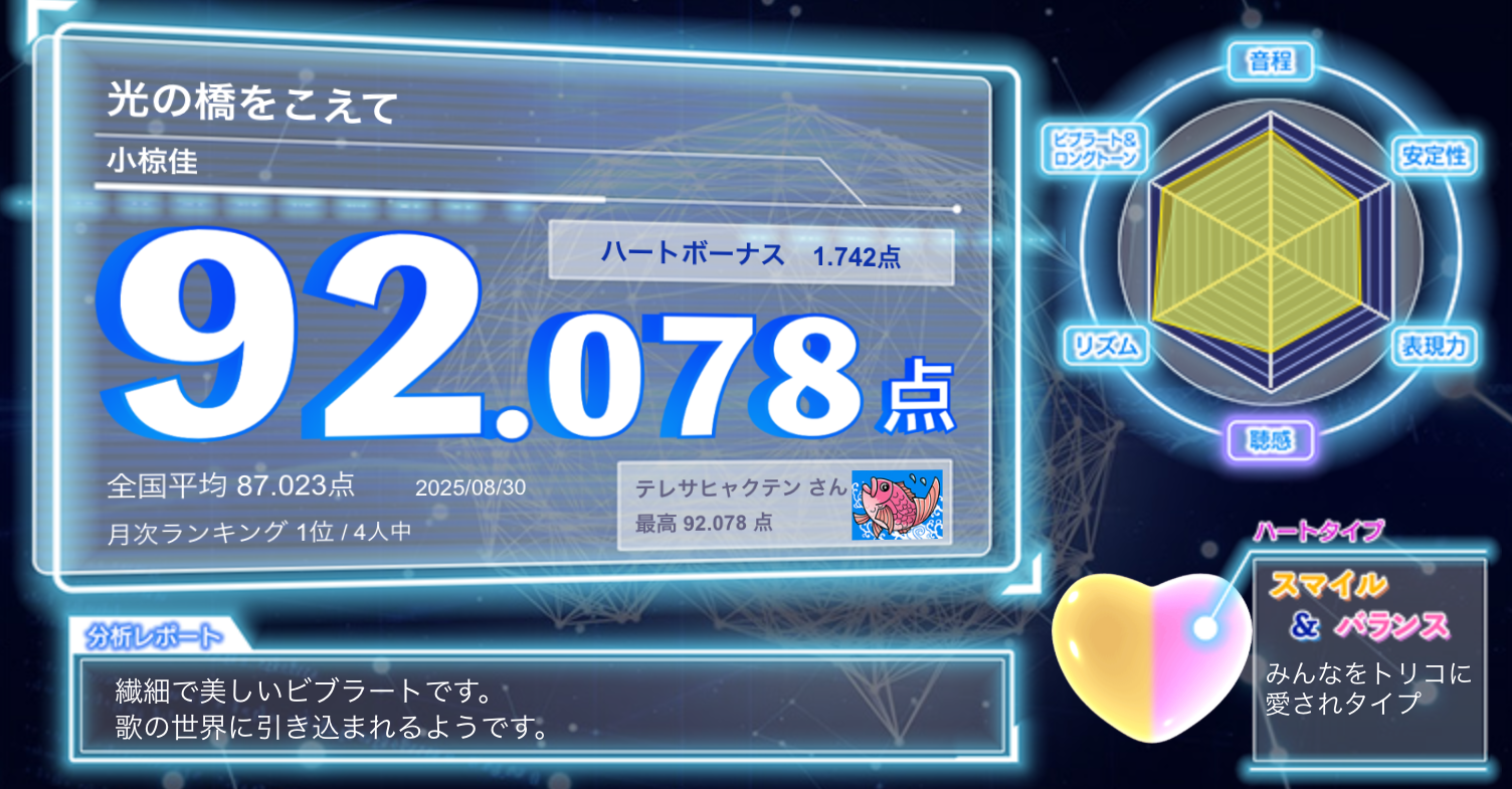 ポテンシャルパワーが発動して難しめの曲でも点数が高めです。