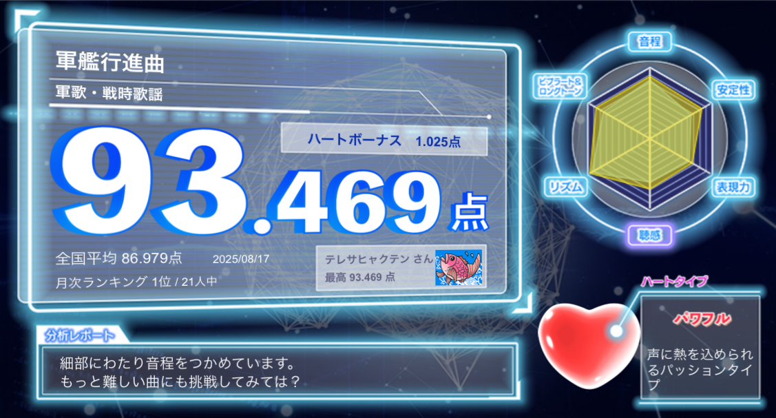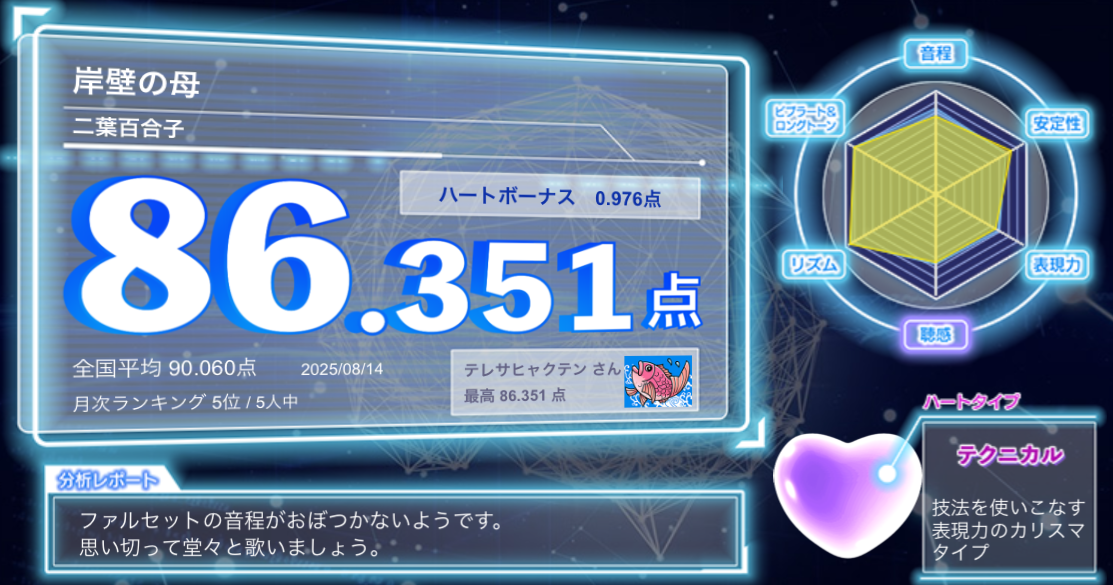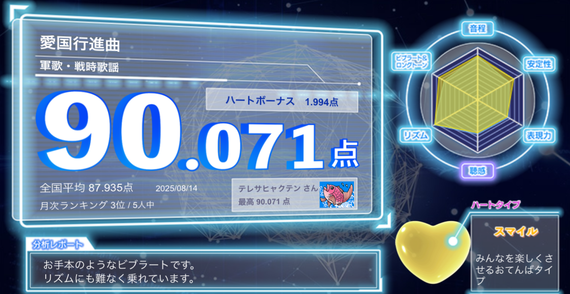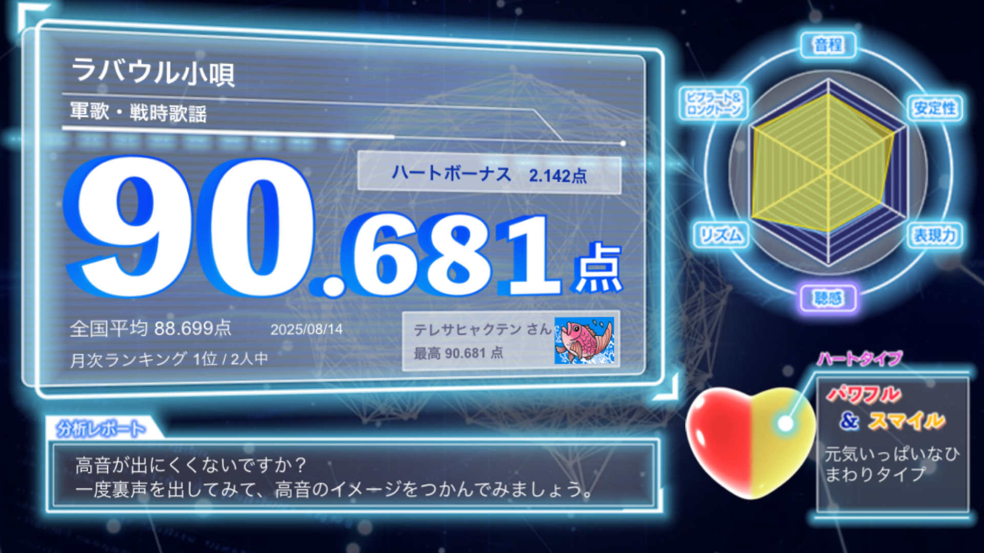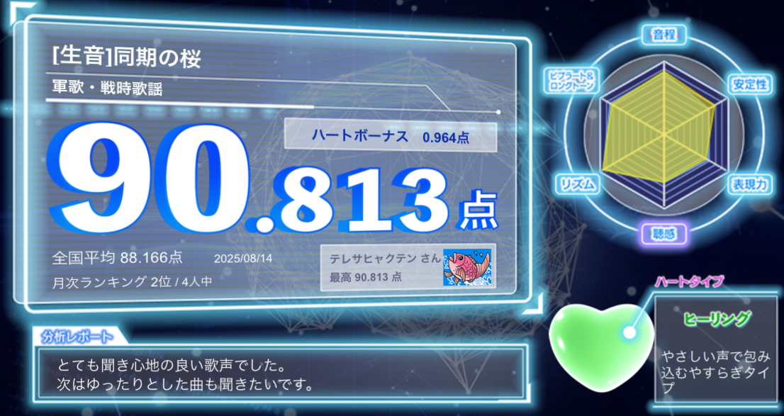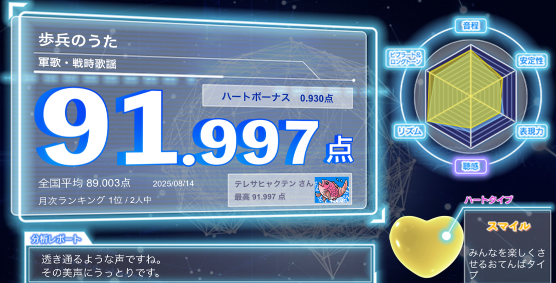 この曲の平均点が低いのは、どっかの芸人も指摘していたけど、キャンチュー全員がライブ感覚でノリで歌っているのを真似して歌っている人が多いためと思われる。そんなに難しい歌ではないので玉屋2060%の音程通りに歌うと点は高くなると思います。