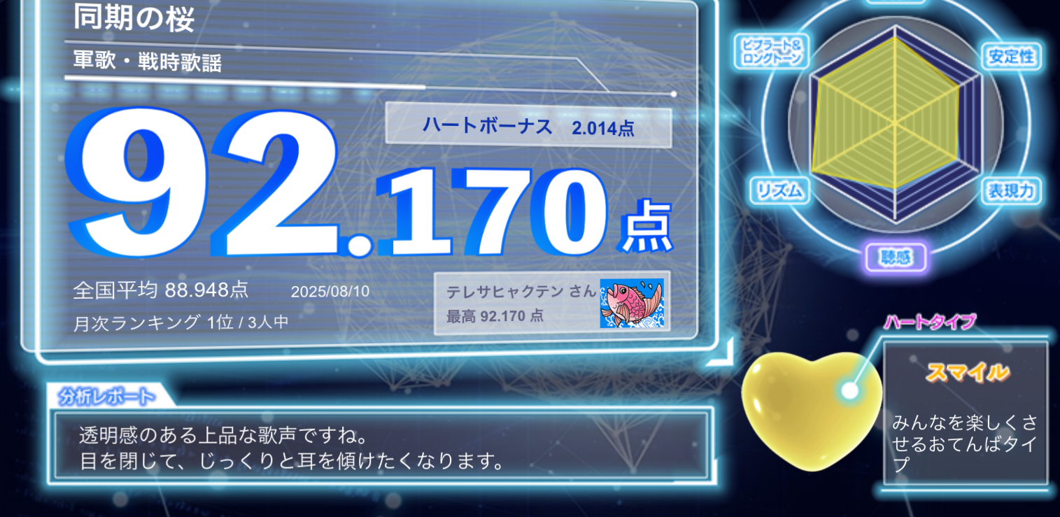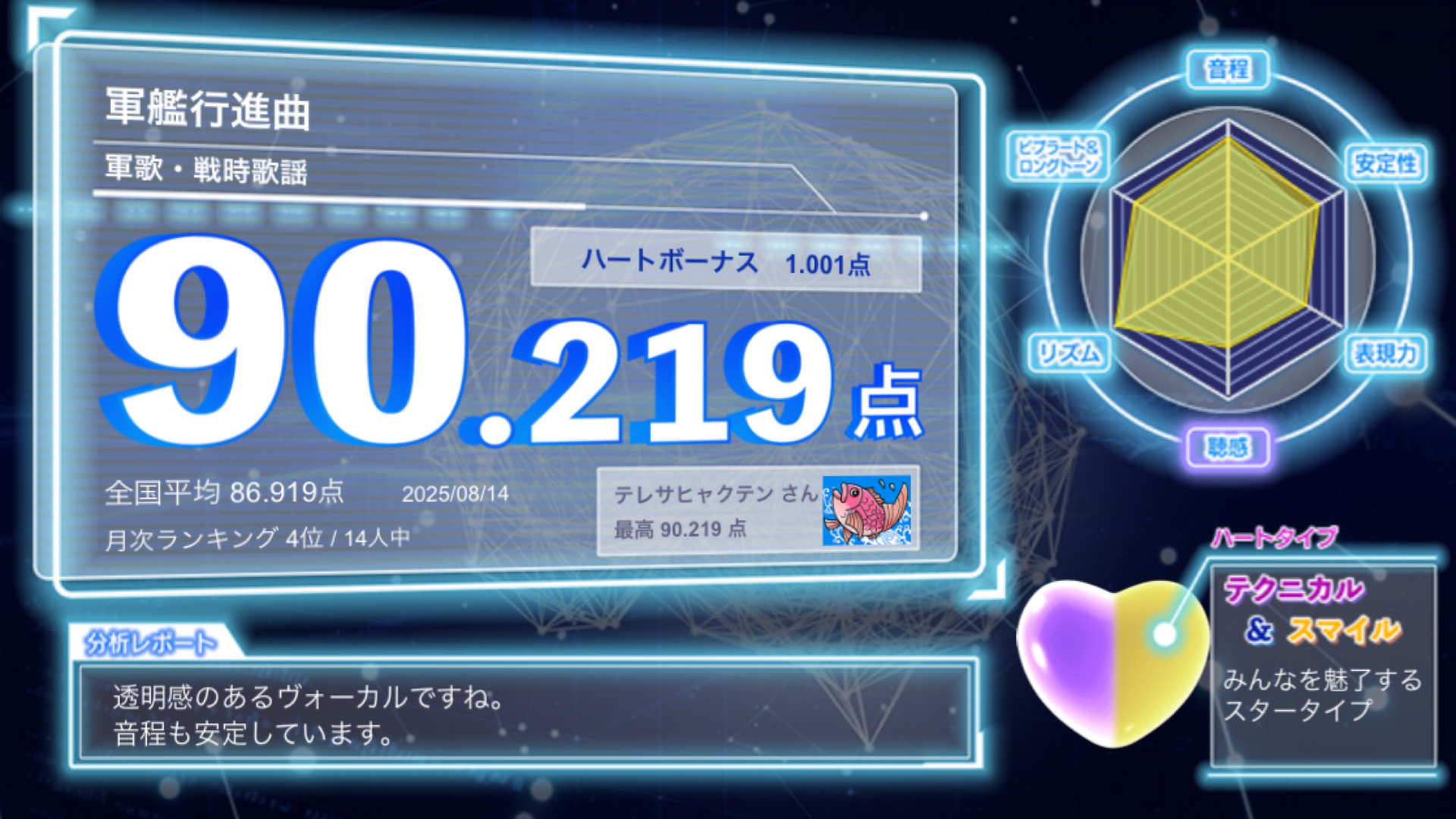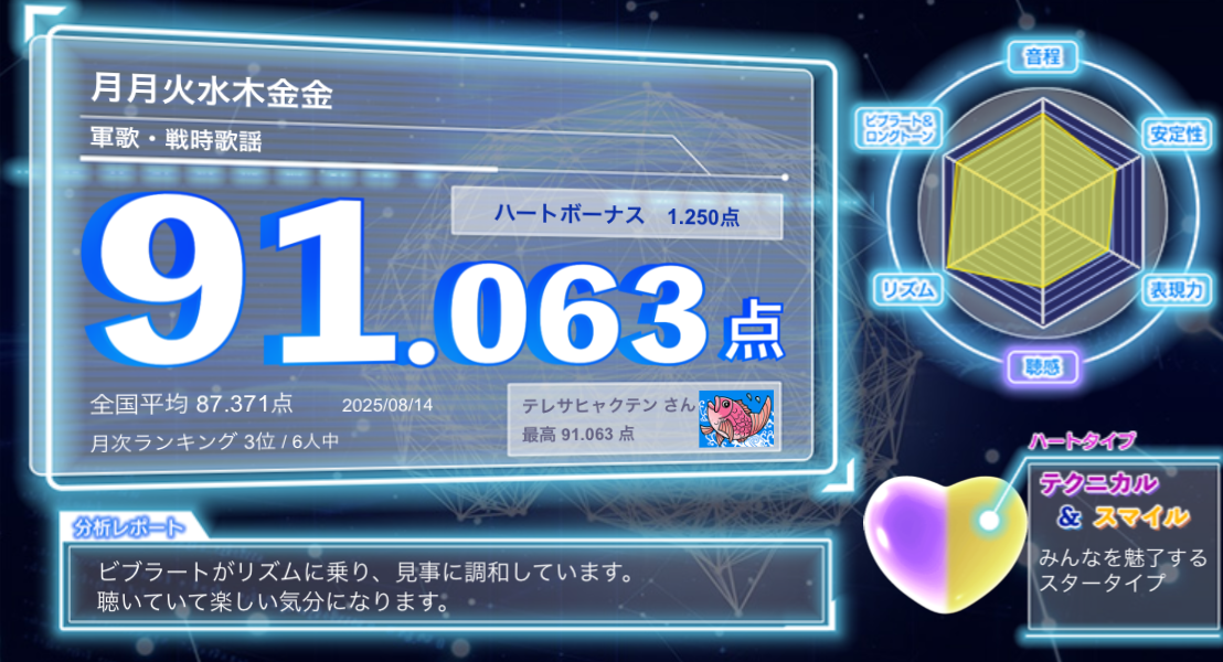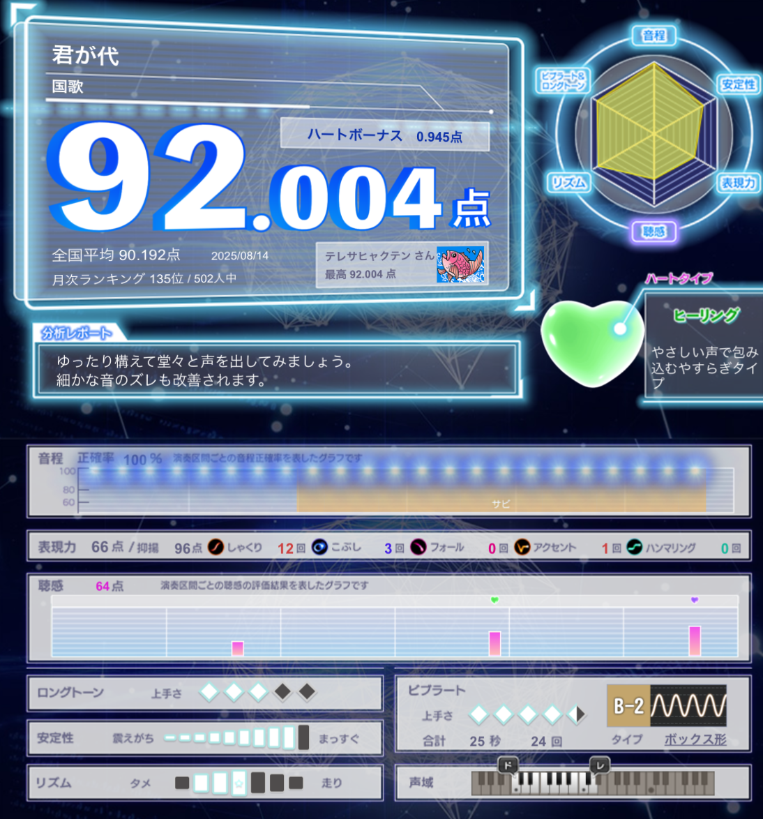 この曲の平均点が低いのは、どっかの芸人も指摘していたけど、キャンチュー全員がライブ感覚でノリで歌っているのを真似して歌っている人が多いためと思われる。そんなに難しい歌ではないので玉屋2060%の音程通りに歌うと点は高くなると思います。