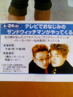 見出しが、杜の都が生んだコワモテコンビ「サンドウィッチマン」がヨーカドーにやって来る!となってました。24日の午後1時と3時の二回で入場無料なので是非行って下さいね~(*^o^*)