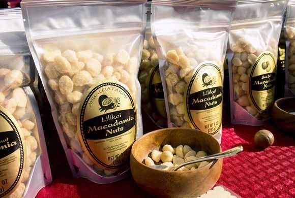 ハワイ島マウナケア山の麓で育てられたマカデミアナッツを、シーソルト、シナモン、リリコイ、パイナップルなどのフレーバーで味付け。アフアロア農場マカデミアナッツ。