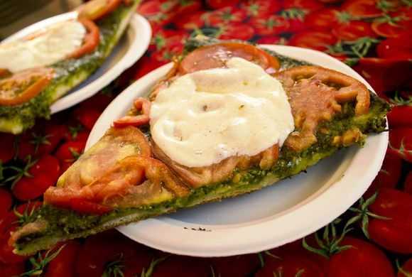 写真2はトマトの甘みたっぷり・焼きたてピザ、フレッシュなバジルソースをベースに、大きくカットした完熟のハワイ産ビッグウェーブトマトと、モッツァレラチーズをたっぷりオン。