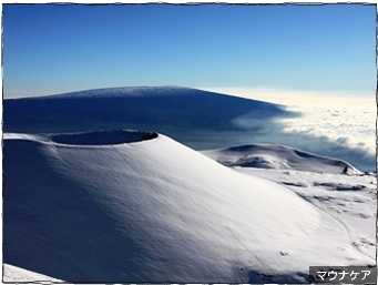 ALOHA!!!マウナケア山 マナウケアはハワイ語で「白い山」という意味。その名の通りハワイで唯一、山頂が雪に覆われます。ハワイ諸島の中でも一番高い山で、海底から測ると世界一の高さとなります。 頂上は雲の上にあるので気候が安定し、乾燥しています。また、高所のため空気が薄く、1年のうち300日以上が晴れで、さらにハワイ島は赤道付近にあるため北半球の天体全部と南半球の天体のほとんどを観測できます。 このような条件のため天体観測には非常に適していて、世界各国が設置した天文台が13基あります。