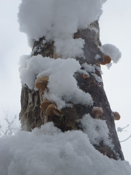 里山歩き【2011・12・21】自宅==(8:30)里山付近……里山……里山付近(12:00)==自宅今年最後の里山歩きに行って来ましたいつも駐車する場所には、雪の為、行けませんでしたなんとか長靴で山に入れるか?と安易な気持ちが大失敗でした雨合羽に短い長靴、中はフリースにヒートテックにホッカイロ2個で武装したのですが、積雪が半端じゃなかったでした膝上まで埋まりながら山頂までラッセルでした時たま見つけたキノコも冷凍状態長靴の中は、雪が入り靴下はびしょびしょ短い長靴は、大失敗でした。(教訓:ゴム長は長いやつを履く!)カンジキかスノーシューを持参すべきでした。早々、敗退して下山、途中熱いラーメンを食べて退散してきました。今度は、雪山歩きを目標に、装備をきちんとして出かけたい思いました。凍っているキノコ里山山頂凍っているキノコ