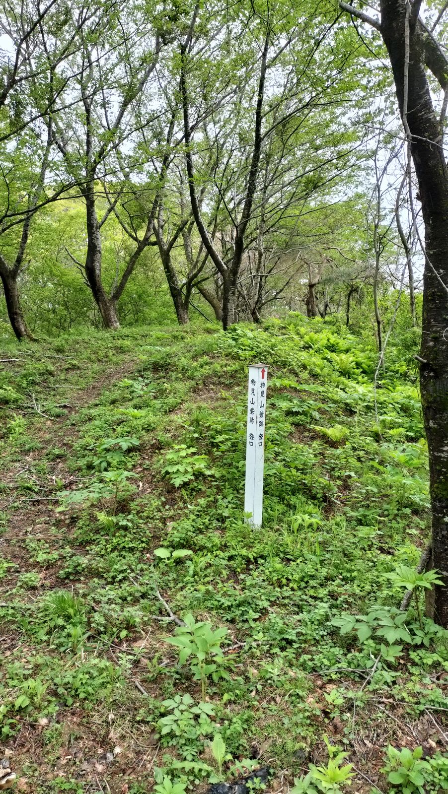 西山 物見山散策【2025.05.06】天気は、曇り→雨宮本ローソンで9:30に待ち合わせ国道脇に車3台を停め9:50出発先輩方と5名で物見山砦跡から登山道の整備に入りました(私は、見てるだけ)先輩方は、ノコギリ・ナタで木や雑草を刈っていきます。登山道整備とは思わずに連れてきてもらいました。12:00にお昼を食べて来た道を帰りました。無事、駐車場に戻り、13:50雪が多かったせいか、八重桜が倒れていました。帰る途中、枝に目を傷つけてしまいました。見た目は、なんともないといわれましたが痛い( ノД`)自宅に戻り、近所の眼科さんが連休でも開いていました。診察してもらうと、右目の黒い瞳の一部の表面が傷ついていると言われ、塗り薬をいただき、通院になりました。先生は、それは痛いはずです。と言われました。当分、治るまで山歩きはお休みしようと思います。物見山峠跡 標識 物見山峠跡登山道整備&赤いテープを取付帰りの物見山峠跡にて折れた八重桜の木