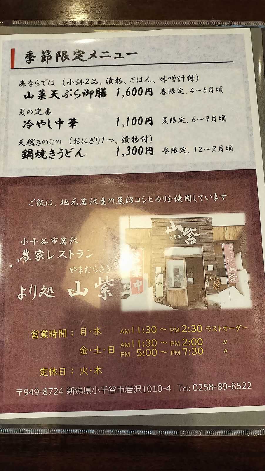 小千谷市岩沢 農家レストラン より処 山紫 メニュー