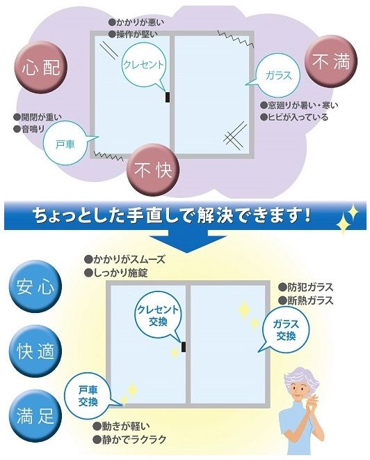 》来店不要、現場確認、見積りは無料《 窓(サッシ)の修理、窓(断熱サッシ)の交換は、富山県内全域に対応します。富山県西部:高岡市、射水市、氷見市、小矢部市、砺波市、南砺市富山県東部:富山市、滑川市、中新川郡、魚津市、黒部市、下新川郡 いい製品を、どこよりも安く! 「窓ガラスが割れた」、「エコ内窓のカギ(クレセント錠)が壊れた」、「防犯ガラスに交換したい」、「高性能トリプルガラス樹脂窓に興味がある」など、窓(サッシ)の修理から、ニーズに対応した窓のリフォーム工事まで、窓まわりのことなら何でもお任せください。窓の専門店です。 "Smart&Eco"な生活スタイル みなさんの住まいでは、冷暖房機器のパワーをいくら上げてもなかなか効果を感じない、ということはありませんか?一般的な住まいでは、外壁や屋根のほか、窓や扉などの開口部からも意外に多くの熱が出入りしています。住まいの断熱は、人が環境と共生しながら快適に暮らしていくうえで、とても大きなメリットがあります。 これからの断熱キーワード? 「窓」 平成4年省エネ基準で建てた住宅モデルにおける例では、夏は外からの熱の侵入は、約 7 割が窓から、また、冬になると暖房熱の約 5 割が窓から流出します。窓からの熱の侵入・流出を効果的に防ぐことで経済的で快適な暮らしをささえます。 もっと快適に、もっと省エネに。リフォームのスタートは、 「窓」 です。いちばん効きやすいところから手を入れる。それがかしこいリフォームのコツ。そのカギをにぎっているのは、何といっても、窓。手軽にはじめて、効果が出やすい窓のリフォームがおすすめです。YKK APは窓のリフォームを通じ、住宅の省エネ化を積極的に推進しています。 》施工実績・トップクラス・創業41周年《 【工事の流れ】1.事前の打合せ。窓まわりの大きさや窓(サッシ)の種類を確認。2.工事開始。古い窓(サッシ)を撤去して、新しい断熱サッシを設置。3.シーリング・建付調整・チェックを行い工事完了。 【工事時間】 約3時間。 現場確認、見積りは無料!まずはお電話ください! 24時間受付 0120-375-345アルミ建材和田 〒933-0062 富山県高岡市江尻856-2 価格保証 かならず他店より安くします!ぜひ、ご相談ください! (社)日本サッシ協会加盟店(社)カーテンウォール・防火開口部協会加盟店 ◇スタッフは、(社)富山県建築組合連合会に加盟した高岡市の建築組合員です。富山県建築組合連合会では、市や町のご協力のもと県内13箇所で、『無料の住宅相談所』を開設しています。富山県の気候風土に適した丈夫で快適な新築や増改築はもちろん、耐震補強工事や住宅診断まで、住まいのことなら何でも、お気軽にご相談ください。 【富山県西部:営業エリア】高岡市、射水市、氷見市、小矢部市、砺波市、南砺市【富山県東部:営業エリア】富山市、滑川市、中新川郡、魚津市、黒部市、下新川郡 【所在地】富山県高岡市江尻856-2 Tel 0120-375-345 【取扱メーカー】三協アルミ、YKK AP、リクシル、旭硝子、日本板硝子、美和ロック、住友3M 来店不要!(電話で、24時間受付中!)