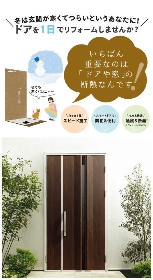 》来店不要、現場確認、見積りは無料《 玄関ドアの修理、玄関ドアの交換は、富山県内全域に対応します。富山県西部:高岡市、射水市、氷見市、小矢部市、砺波市、南砺市富山県東部:富山市、滑川市、中新川郡、魚津市、黒部市、下新川郡 いい製品を、どこよりも安く! 「玄関ドアのガラスが割れた」、「玄関ドアのカギ(ハンドル錠)が壊れた」、「もっと明るく暖かい玄関にしたい」、「玄関ドアの防犯面をよくしたい。家族を守りたい」、「さわやかな自然の風を取り入れることができる玄関にしたい」、「玄関が冷蔵庫みたいに寒い」、「最新のスマート ドアに、交換したい」など、玄関ドアの修理から、ニーズに対応した玄関のリフォーム工事まで、玄関まわりのことなら何でもお任せください。 YKK AP 断熱玄関ドア ヴェナート快適で上質な毎日へ。あなたらしい玄関ドアを見つけてください。玄関ドアは、顔、心、表現。家族を守り、そして自分らしさを示すシンボルにもなります。細部までこだわりぬいた重厚なドアからシンプルなドアまで、豊富なデザインがそろった玄関ドア「ヴェナート」。あなたにふさわしいデザインを、質感を、色合いを見つけてください。きっと、より快適で上質な毎日がはじまります。貴方の大事な住まい、もっと快適にしませんか? たった1日でデキるんです!「玄関のリフォームって大変」とお考えではありませんか。実はリフォーム工事は、それほど時間もかからず、手軽で簡単。玄関のリフォームは、半日から1日程度で完了します。もちろん、品質も確かで安心です。より快適な住まいへ、リフォームしてみませんか。 》施工実績・トップクラス・創業42周年《 【工事の流れ】1.事前の打合せ。玄関まわりの大きさや玄関ドアの種類を確認。2.工事開始。古くなったドアを撤去して、新しい断熱ドアを設置。3.シーリング・建付調整・チェックを行い工事完了。 【工事期間】 半日~1日。 現場確認、見積りは無料!まずはお電話ください! 24時間受付 0120-375-345アルミ建材和田 〒933-0062 富山県高岡市江尻856-2 価格保証 かならず他店より安くします!ぜひ、ご相談ください! (社)日本サッシ協会加盟店(社)カーテンウォール・防火開口部協会加盟店 ◇スタッフは、(社)富山県建築組合連合会に加盟した高岡市の建築組合員です。富山県建築組合連合会では、市や町のご協力のもと県内13箇所で、『無料の住宅相談所』を開設しています。富山県の気候風土に適した快適で丈夫な新築や増改築はもちろん、住宅診断や耐震補強工事まで、住まいのことなら何でも、お気軽にご相談ください。 【富山県西部:営業エリア】高岡市、射水市、氷見市、小矢部市、砺波市、南砺市【富山県東部:営業エリア】富山市、滑川市、中新川郡、魚津市、黒部市、下新川郡 【所在地】富山県高岡市江尻856-2 Tel 0120-375-345 【取扱メーカー】三協アルミ、YKK AP、リクシル、旭硝子、日本板硝子、美和ロック、住友3M 来店不要!(電話で、24時間受付中!)