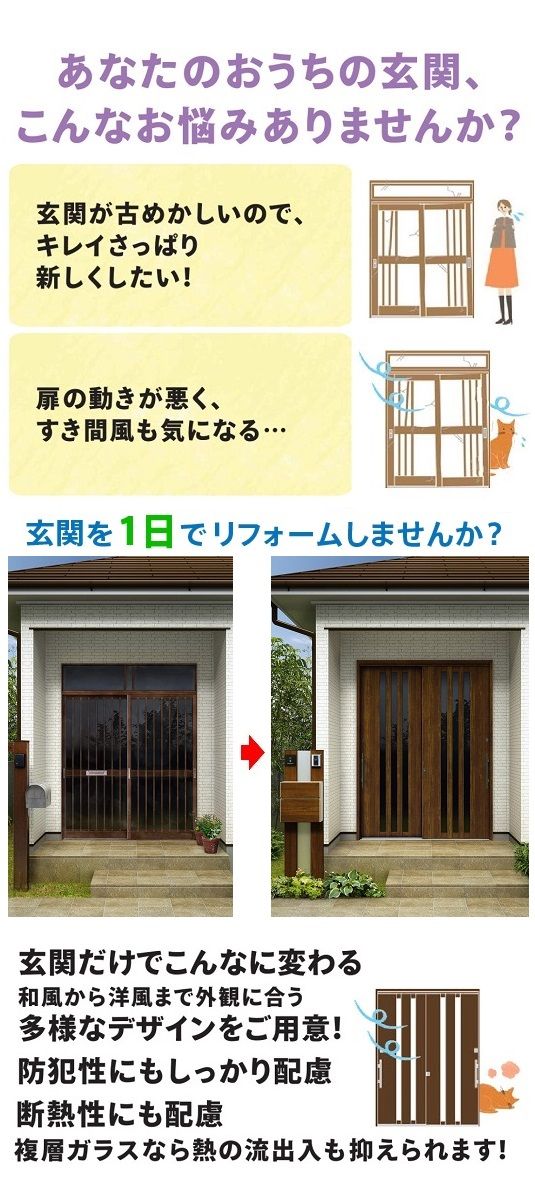 》来店不要、現場確認、見積りは無料《 玄関引戸の修理、玄関引戸の交換工事は、富山県内全域に対応します。富山県西部:高岡市、射水市、氷見市、小矢部市、砺波市、南砺市富山県東部:富山市、滑川市、中新川郡、魚津市、黒部市、下新川郡 いい製品を、どこよりも安く! 「玄関引戸のガラスが割れた」、「玄関引戸のカギ(錠)が壊れた」、「玄関が寒い、暖かくしたい」、「さわやかな自然の風を玄関からも通したい」、「玄関引戸の防犯性を高めたい。家族を守りたい」、「ベビーカーや車イスでも広く、使いやすい玄関にしたい」など、玄関引戸の修理から、様々なニーズに対応した玄関のリフォーム工事まで、玄関まわりのことなら何でもお任せください。 貴方の大事な住まい、もっと快適にしませんか? たった1日でデキるんです!「窓や玄関のリフォームって大変」とお考えではありませんか。実はリフォーム工事は、それほど時間もかからず、手軽で簡単。窓の改修なら最短で、約30分。玄関のリフォームでも半日から1日程度で完了します。もちろん、品質も確かで安心です。より快適な住まいへ、リフォームしてみませんか。 YKK AP 玄関引戸 れん樹 Japanese Style Sliding Door毎日出入りする玄関だから、広く、使いやすく。大開口引戸が実現します。スライド機構の玄関引戸は、設置する場所を選びません。たとえば駐車スペースとアプローチを兼用したり、階上に玄関を設けたり、また、開閉もしやすいのでバリアフリー設計にも最適です。広いスペースではもちろん、限られたスペースでの設計の自由度を大きく高めます。 》施工実績・トップクラス・創業42周年《 【工事の流れ】1.事前の打合せ。玄関まわりの大きさや玄関引戸の種類を確認。2.工事開始。古い玄関引戸を撤去して、新しい断熱玄関引戸を設置。3.シーリング・建付調整・チェックを行い工事完了。 【工事期間】 約1日。 現場確認、見積りは無料!まずはお電話ください! 24時間受付 0120-375-345アルミ建材和田 〒933-0062 富山県高岡市江尻856-2 価格保証 かならず他店より安くします!ぜひ、ご相談ください! (社)日本サッシ協会加盟店(社)カーテンウォール・防火開口部協会加盟店 ◇スタッフは、(社)富山県建築組合連合会に加盟した高岡市の建築組合員です。富山県建築組合連合会では、市や町のご協力のもと県内13箇所で、『無料の住宅相談所』を開設しています。富山県の気候風土に適した丈夫で快適な新築や増改築はもちろん、耐震補強工事や住宅診断まで、住まいのことなら何でも、お気軽にご相談ください。 【富山県西部:営業エリア】高岡市、射水市、氷見市、小矢部市、砺波市、南砺市【富山県東部:営業エリア】富山市、滑川市、中新川郡、魚津市、黒部市、下新川郡 【所在地】富山県高岡市江尻856-2 Tel 0120-375-345 【取扱メーカー】三協アルミ、YKK AP、リクシル、旭硝子、日本板硝子、美和ロック、住友3M 来店不要!(電話で、24時間受付中!)