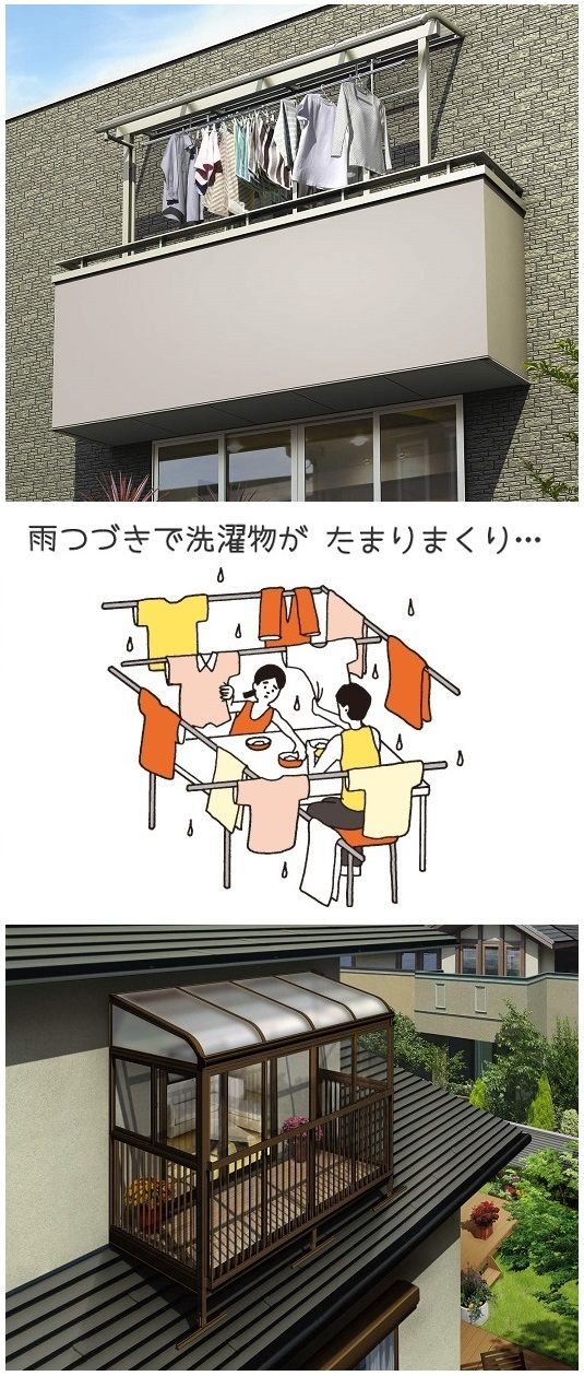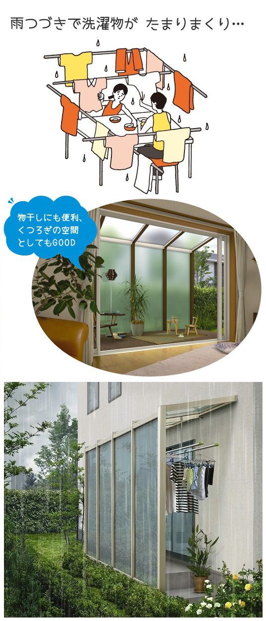 》来店不要、現場確認、見積りは無料《 ガーデンルームの修理、ガーデンルームの新設工事は、富山県内全域に対応します。富山県西部:高岡市、射水市、氷見市、小矢部市、砺波市、南砺市富山県西部:富山市、滑川市、中新川郡、魚津市、黒部市、下新川郡 いい製品を、どこよりも安く! 「ガーデンルームの屋根が豪雪で壊れた」、「ガーデンルームのガラスが割れた」、「雨の日でも安心して使える洗濯物干し場として、ガーデンルームがほしい」など、ガーデンルームの修理から、リフォームニーズに対応したガーデンルームの新設工事まで、テラスまわりのことなら何でもお任せください。エクステリア工事の専門店です。 YKK AP 正面デザインパネル付き屋根 アウタールーフ ガーデンルームタイプ窓辺が広がる、暮らしが広がる。『アウタールーフ』は、テラス戸や勝手口に取付けることでウチからソトへ、生活の幅を広げる新発想の商品です。 雨の日の物干し場に洗濯機からすぐに行けるので移動がラクラク。雨の日でも手軽に物干しができます。面倒なバルコニーへの移動や、リビングを占拠する室内干しのお悩みを解決します。キッチンの収納スペースにすぐに増えてしまう生ゴミや新聞紙、ビール缶、ペットボトルなど・・・・・キッチンに溜ってしまいがちなゴミも、スッキリ片付きます。イヤな臭いの問題も解決します。セルフクリーニング効果正面デザインパネルは強化ガラスです。強化ガラスはセルフクリーニング機能〈光触媒コート〉を標準装備した強化ガラスです。イージーメンテナンスでガラスの美しさを保ちます。 》施工実績・トップクラス・創業42周年《 【工事の流れ】1.事前の打合せ。ガーデンルームの大きさや種類を確認。2.工事開始。ガーデンルームを設置。3.シーリング・建付調整・チェックを行い工事完了。 【工事期間】 約1日。 現場確認、見積りは無料!まずはお電話ください! 24時間受付 0120-375-345アルミ建材和田 〒933-0062 富山県高岡市江尻856-2 価格保証 かならず他店より安くします!ぜひ、ご相談ください! (社)日本サッシ協会加盟店(社)カーテンウォール・防火開口部協会加盟店 ◇スタッフは、(社)富山県建築組合連合会に加盟した高岡市の建築組合員です。富山県建築組合連合会では、市や町のご協力のもと県内13箇所で、『無料の住宅相談所』を開設しています。富山県の気候風土に適した丈夫で快適な新築や増改築はもちろん、住宅診断や耐震補強工事まで、住まいのことなら何でも、お気軽にご相談ください。 【富山県西部:営業エリア】高岡市、射水市、氷見市、小矢部市、砺波市、南砺市【富山県東部:営業エリア】富山市、滑川市、中新川郡、魚津市、黒部市、下新川郡 【所在地】富山県高岡市江尻856-2 Tel 0120-375-345 【取扱メーカー】三協アルミ、YKK AP、リクシル、旭硝子、日本板硝子、美和ロック、住友3M 来店不要!(電話で、24時間受付中!)