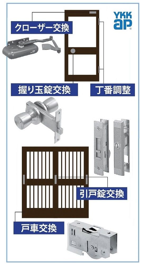 》来店不要、現場確認、見積りは無料《 カギ(錠)の修理、カギ(錠)の交換は、富山県内全域に対応します。富山県西部:高岡市、射水市、氷見市、小矢部市、砺波市、南砺市富山県東部:富山市、滑川市、中新川郡、魚津市、黒部市、下新川郡 ◆地域に根差した窓・ドアの修理の専門店です。お気軽にご相談ください。 いい製品を、どこよりも安く! 「玄関ドアのカギ(ハンドル錠)が閉まりにくい」、「エコ内窓のカギ(クレセント錠)が壊れた」、「家族を守りたい。住まいの防犯性を高めたい」、「高性能のシリンダー錠に興味がある」など、鍵(錠)の修理から、ニーズに対応した防犯リフォーム工事まで、住まいの防犯対策のことなら何でもお任せください。 》施工実績・トップクラス・創業42周年《 【工事の流れ】1.事前の打合せ。カギ(錠)の大きさやカギ(錠)の種類を確認。2.工事開始。古い錠を撤去して、新しい高性能シリンダー錠を取付け。3.建付調整・チェックを行い工事完了。 【工事時間】 約1時間。 現場確認、見積りは無料!まずはお電話ください! 24時間受付 0120-375-345アルミ建材和田 〒933-0062 富山県高岡市江尻856-2 価格保証 かならず他店より安くします!ぜひ、ご相談ください! (社)日本サッシ協会加盟店(社)カーテンウォール・防火開口部協会加盟店 ◇スタッフは、(社)富山県建築組合連合会に加盟した高岡市の建築組合員です。富山県建築組合連合会では、市や町のご協力のもと県内13箇所で、『無料の住宅相談所』を開設しています。富山県の気候風土に適した丈夫で快適な新築や増改築はもちろん、住宅診断や耐震補強工事まで、住まいのことなら何でも、お気軽にご相談ください。 【富山県西部:営業エリア】高岡市、射水市、氷見市、小矢部市、砺波市、南砺市【富山県東部:営業エリア】富山市、滑川市、中新川郡、魚津市、黒部市、下新川郡 【所在地】富山県高岡市江尻856-2 Tel 0120-375-345 【取扱メーカー】三協アルミ、YKK AP、リクシル、旭硝子、日本板硝子、美和ロック、住友3M 来店不要!(電話で、24時間受付中!)