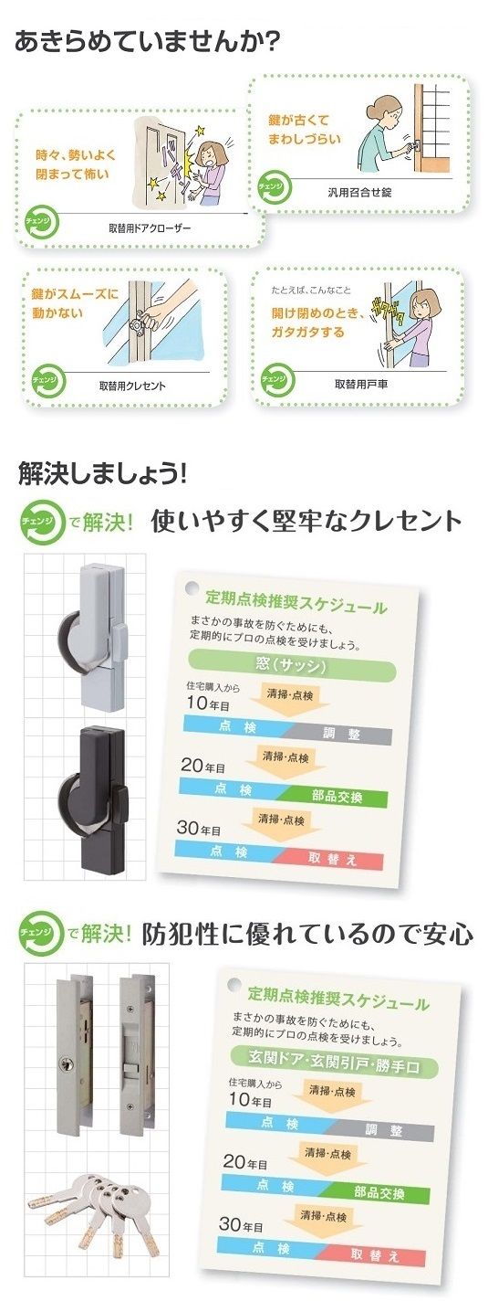 》来店不要、現場確認、見積りは無料《 カギ(錠)の修理、カギ(錠)の交換は、富山県内全域に対応します。富山県西部:高岡市、射水市、氷見市、小矢部市、砺波市、南砺市富山県東部:富山市、滑川市、中新川郡、魚津市、黒部市、下新川郡 ◆地域に根差した窓・ドアの修理の専門店です。お気軽にご相談ください。 いい製品を、どこよりも安く! 「玄関ドアのカギ(ハンドル錠)が閉まりにくい」、「エコ内窓のカギ(クレセント錠)が壊れた」、「家族を守りたい。住まいの防犯性を高めたい」、「高性能のシリンダー錠に興味がある」など、鍵(錠)の修理から、ニーズに対応した防犯リフォーム工事まで、住まいの防犯対策のことなら何でもお任せください。 》施工実績・トップクラス・創業42周年《 【工事の流れ】1.事前の打合せ。カギ(錠)の大きさやカギ(錠)の種類を確認。2.工事開始。古い錠を撤去して、新しい高性能シリンダー錠を取付け。3.建付調整・チェックを行い工事完了。 【工事時間】 約1時間。 現場確認、見積りは無料!まずはお電話ください! 24時間受付 0120-375-345アルミ建材和田 〒933-0062 富山県高岡市江尻856-2 価格保証 かならず他店より安くします!ぜひ、ご相談ください! (社)日本サッシ協会加盟店(社)カーテンウォール・防火開口部協会加盟店 ◇スタッフは、(社)富山県建築組合連合会に加盟した高岡市の建築組合員です。富山県建築組合連合会では、市や町のご協力のもと県内13箇所で、『無料の住宅相談所』を開設しています。富山県の気候風土に適した丈夫で快適な新築や増改築はもちろん、住宅診断や耐震補強工事まで、住まいのことなら何でも、お気軽にご相談ください。 【富山県西部:営業エリア】高岡市、射水市、氷見市、小矢部市、砺波市、南砺市【富山県東部:営業エリア】富山市、滑川市、中新川郡、魚津市、黒部市、下新川郡 【所在地】富山県高岡市江尻856-2 Tel 0120-375-345 【取扱メーカー】三協アルミ、YKK AP、リクシル、旭硝子、日本板硝子、美和ロック、住友3M 来店不要!(電話で、24時間受付中!)