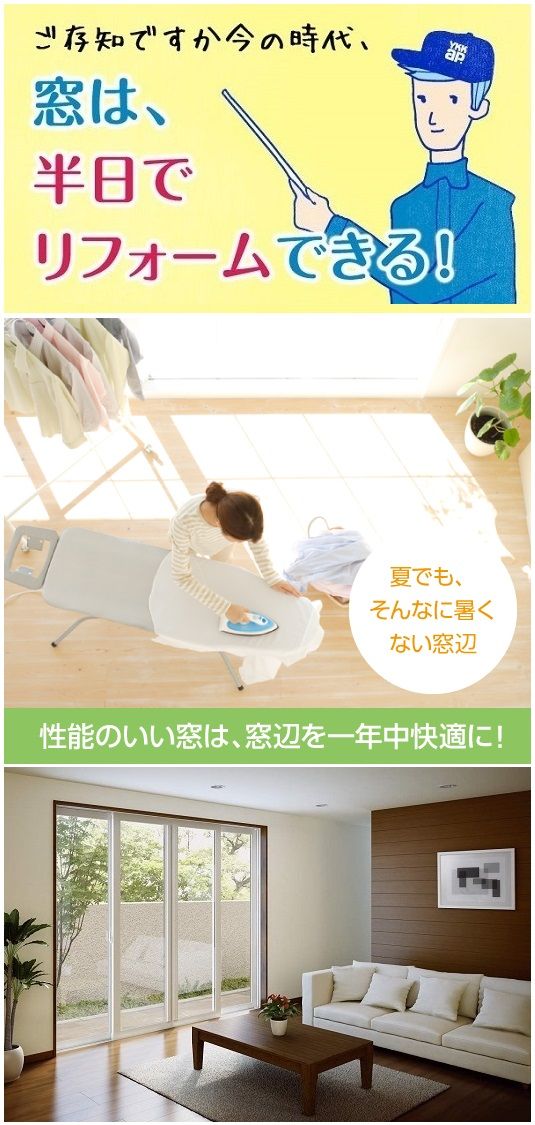 》来店不要、現場確認、見積りは無料《 窓(サッシ)の修理、窓(断熱サッシ)の交換は、富山県内全域に対応します。富山県西部:高岡市、射水市、氷見市、小矢部市、砺波市、南砺市富山県東部:富山市、滑川市、中新川郡、魚津市、黒部市、下新川郡 いい製品を、どこよりも安く! 「窓ガラスが割れた」、「エコ内窓のカギ(クレセント錠)が壊れた」、「防犯ガラスに交換したい」、「高性能トリプルガラス樹脂窓に興味がある」など、窓(サッシ)の修理から、ニーズに対応した窓のリフォーム工事まで、窓まわりのことなら何でもお任せください。窓の専門店です。 "Smart&Eco"な生活スタイル みなさんの住まいでは、冷暖房機器のパワーをいくら上げてもなかなか効果を感じない、ということはありませんか?一般的な住まいでは、外壁や屋根のほか、窓や扉などの開口部からも意外に多くの熱が出入りしています。住まいの断熱は、人が環境と共生しながら快適に暮らしていくうえで、とても大きなメリットがあります。 これからの断熱キーワード? 「窓」 平成4年省エネ基準で建てた住宅モデルにおける例では、夏は外からの熱の侵入は、約 7 割が窓から、また、冬になると暖房熱の約 5 割が窓から流出します。窓からの熱の侵入・流出を効果的に防ぐことで経済的で快適な暮らしをささえます。 もっと快適に、もっと省エネに。リフォームのスタートは、 「窓」 です。いちばん効きやすいところから手を入れる。それがかしこいリフォームのコツ。そのカギをにぎっているのは、何といっても、窓。手軽にはじめて、効果が出やすい窓のリフォームがおすすめです。YKK APは窓のリフォームを通じ、住宅の省エネ化を積極的に推進しています。 》施工実績・トップクラス・創業42周年《 【工事の流れ】1.事前の打合せ。窓まわりの大きさや窓(サッシ)の種類を確認。2.工事開始。古い窓(サッシ)を撤去して、新しい断熱サッシを設置。3.シーリング・建付調整・チェックを行い工事完了。 【工事時間】 約3時間。 現場確認、見積りは無料!まずはお電話ください! 24時間受付 0120-375-345アルミ建材和田 〒933-0062 富山県高岡市江尻856-2 価格保証 かならず他店より安くします!ぜひ、ご相談ください! (社)日本サッシ協会加盟店(社)カーテンウォール・防火開口部協会加盟店 ◇スタッフは、(社)富山県建築組合連合会に加盟した高岡市の建築組合員です。富山県建築組合連合会では、市や町のご協力のもと県内13箇所で、『無料の住宅相談所』を開設しています。富山県の気候風土に適した丈夫で快適な新築や増改築はもちろん、耐震補強工事や住宅診断まで、住まいのことなら何でも、お気軽にご相談ください。 【富山県西部:営業エリア】高岡市、射水市、氷見市、小矢部市、砺波市、南砺市【富山県東部:営業エリア】富山市、滑川市、中新川郡、魚津市、黒部市、下新川郡 【所在地】富山県高岡市江尻856-2 Tel 0120-375-345 【取扱メーカー】三協アルミ、YKK AP、リクシル、旭硝子、日本板硝子、美和ロック、住友3M 来店不要!(電話で、24時間受付中!)