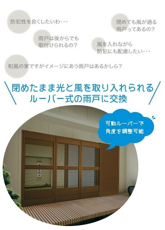》来店不要、現場確認、見積りは無料《 雨戸の修理、雨戸の後付け工事は、富山県内全域に対応します。富山県西部:高岡市、射水市、氷見市、小矢部市、砺波市、南砺市富山県東部:富山市、滑川市、中新川郡、魚津市、黒部市、下新川郡 いい製品を、どこよりも安く! 「雨戸の枠が、グラグラする」、「雨戸のカギ(錠)が閉まりにくい」、「台風に強い窓にしたい」、「窓まわりの防犯性を良くしたい」など、雨戸の修理から、ニーズに対応した窓まわりのリフォーム工事まで、窓まわりのことなら何でもお任せください。窓の専門店です。 YKK AP 雨戸枠9AF後付のすっきりした外観、防風雨や防犯対策に幅広く対応します。外壁工事は必要ありません。凹凸のある壁面でもスピーディーに取付けられます。通風雨戸なら、可動ルーバーの角度調整により、通風・採光・プライバシーの確保を自由に行えます。ルーバーは軽くて丈夫なアルミ製。耐風圧に優れ、風の強い日でも安心。ルーバー角度はシンプルなスライド操作で調整可能。下部には、固定パネルを設け、防犯にも配慮しました。 》施工実績・トップクラス・創業42周年《 【工事の流れ】1.事前の打合せ。窓まわりの大きさや雨戸の種類を確認。2.工事開始。今ある窓の外側に、雨戸枠を設置し雨戸を建込む。3.シーリング・建付調整・チェックを行い工事完了。 【工事時間】 約3時間。 現場確認、見積りは無料!まずはお電話ください! 24時間受付 0120-375-345アルミ建材和田 〒933-0062 富山県高岡市江尻856-2 価格保証 とことん安くします!ぜひ、ご相談ください! (社)日本サッシ協会加盟店(社)カーテンウォール・防火開口部協会加盟店 ◇スタッフは、(社)富山県建築組合連合会に加盟した高岡市の建築組合員です。富山県建築組合連合会では、市や町のご協力のもと県内13箇所で、『無料の住宅相談所』を開設しています。富山県の気候風土に適した丈夫で、一年中快適な新築や増改築はもちろん、耐震補強工事や住宅診断まで、住まいのことなら何でも、お気軽にご相談ください。 【富山県西部:営業エリア】高岡市、射水市、氷見市、小矢部市、砺波市、南砺市【富山県東部:営業エリア】富山市、滑川市、中新川郡、魚津市、黒部市、下新川郡 【所在地】富山県高岡市江尻856-2 Tel 0120-375-345 【取扱メーカー】三協アルミ、YKK AP、リクシル、旭硝子、日本板硝子、美和ロック、住友3M 来店不要!(電話で、24時間受付中!)