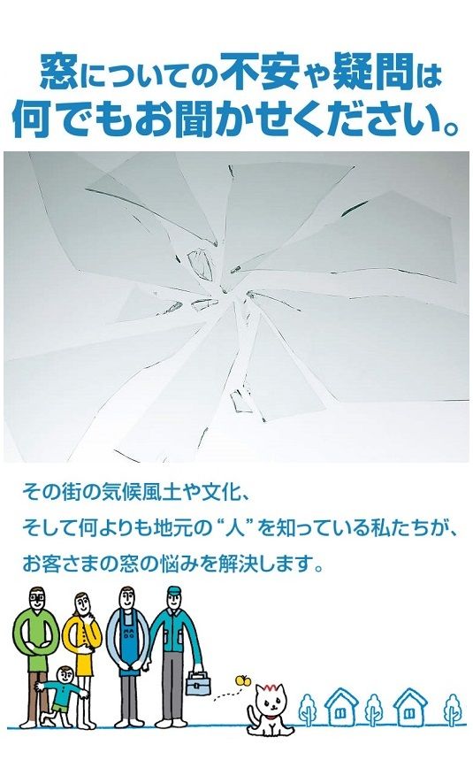 》来店不要、現場確認、見積りは無料《 窓ガラス修理、窓ガラス(アタッチメント付複層ガラス)交換は、富山県内全域に対応します。富山県西部:高岡市、射水市、氷見市、小矢部市、砺波市、南砺市富山県東部:富山市、滑川市、中新川郡、魚津市、黒部市、下新川郡 いい製品を、どこよりも安く! 「窓ガラスが割れた」、「エコ内窓のカギ(クレセント錠)が壊れた」、「防犯ガラスに交換したい」、「高性能トリプルガラス樹脂窓に興味がある」など、窓ガラスの修理から、ニーズに対応した窓のリフォーム工事まで、窓まわりのことなら何でもお任せください。窓の専門店です。 "Smart&Eco"な生活スタイル みなさんの住まいでは、冷暖房機器のパワーをいくら上げてもなかなか効果を感じない、ということはありませんか?一般的な住まいでは、外壁や屋根のほか、窓や扉などの開口部からも意外に多くの熱が出入りしています。住まいの断熱は、人が環境と共生しながら快適に暮らしていくうえで、とても大きなメリットがあります。 これからの断熱キーワード? 「窓」平成4年省エネ基準で建てた住宅モデルにおける例では、夏は外からの熱の侵入は、約 7 割が窓から、また、冬になると暖房熱の約 5 割が窓から流出します。窓からの熱の侵入・流出を効果的に防ぐことで経済的で快適な暮らしをささえます。 ガラス選びで更に賢く節約夏期の日射遮蔽と冬期の日射取得を考えて Low-Eガラスにしたら、年間冷暖房費「10%カット」冬は室内熱を外へ逃がさないため、冷暖房効率を高めます。いちばん効きやすいところから手を入れる。それがかしこいリフォームのコツ。そのカギをにぎっているのは、何といっても、窓。手軽にはじめて、効果が出やすい窓のリフォームがおすすめです。 YKK AP アタッチメント付複層ガラス単板ガラス用サッシに簡単に取付けて断熱性をアップ。既存の窓をそのまま活かせる。低コスト、スピード施工で効率よく省エネ化。既存の障子にそのままセットできる後付型の複層ガラスです。外壁を壊すなどの大がかりな工事は不要で、サッシから単板ガラスを外して「アタッチメント付複層ガラス」に組み替えるだけです。取付けは室内の作業で、1窓あたり約60分で完了します。 結露を抑えるために住まいを断熱化する窓は冷たい外気の影響を一番受けやすいと言えます。したがって、窓を断熱化することが大きなポイントとなります。断熱窓(YKKAP Low-E複層ガラス)を使うことで、外の冷気が室内に伝わりにくく、室内側の窓フレームの表面温度が下がりにくくなるので、結露の発生を抑えることができます。 》施工実績・トップクラス・創業42周年《 【工事の流れ】1.事前の打合せ。アタッチメント付複層ガラスの大きさや種類を確認。2.工事開始。古いガラスを撤去して、新しいアタッチメント付複層ガラスを設置。3.建付調整・チェックを行い工事完了。 【工事時間】 約60分。 現場確認、見積りは無料!まずはお電話ください! 24時間受付 0120-375-345アルミ建材和田 〒933-0062 富山県高岡市江尻856-2 価格保証 かならず他店より安くします!ぜひ、ご相談ください! (社)日本サッシ協会加盟店(社)カーテンウォール・防火開口部協会加盟店 ◇スタッフは、(社)富山県建築組合連合会に加盟した高岡市の建築組合員です。富山県建築組合連合会では市や町のご協力のもと県内13カ所で、『無料の住宅相談所』を開設しています。富山県の気候風土に適した丈夫で快適な新築や増改築はもちろん、住宅診断や耐震補強工事まで、住まいのことなら何でも、お気軽にご相談ください。 【富山県西部:営業エリア】高岡市、射水市、氷見市、小矢部市、砺波市、南砺市【富山県東部:営業エリア】富山市、滑川市、中新川郡、魚津市、黒部市、下新川郡 【所在地】富山県高岡市江尻856-2 Tel 0120-375-345 【取扱メーカー】三協アルミ、YKK AP、リクシル、旭硝子、日本板硝子、美和ロック、住友3M 来店不要!(電話で、24時間受付中!)