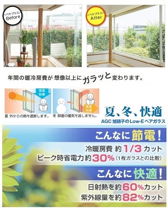 》来店不要、現場確認、見積りは無料《 窓ガラス修理、窓ガラス(断熱硝子)交換は、富山県内全域に対応します。富山県西部:高岡市、射水市、氷見市、小矢部市、砺波市、南砺市富山県東部:富山市、滑川市、中新川郡、魚津市、黒部市、下新川郡 いい製品を、どこよりも安く! 「窓ガラスが割れた」、「エコ内窓のカギ(クレセント錠)が壊れた」、「防犯ガラスに交換したい」、「高性能トリプルガラス樹脂窓に興味がある」など、窓ガラスの修理から、ニーズに対応した窓のリフォーム工事まで、窓まわりのことなら何でもお任せください。窓の専門店です。 節電の鍵、それは窓ガラス日本中で取り組んでいる家庭の節電、鍵を握るのは窓ガラスです。暑くない、寒くない、でも明るい。これまでの常識を超えたガラス、それがAGCのLow-Eペアガラス。冷暖房使用量を大幅に減らしても快適。「我慢しない節電」を実現します。高断熱仕様(特殊金属をコーティングしたLow-Eガラス)は、冬の日差しを室内に入れ、暖房熱を室外に逃がさないことで、冬季の暖房負荷を軽減します。 AGC 旭硝子 ペヤプラス今お使いのサッシをそのままに、エコガラスに簡単に取り替え。短時間で快適空間にできる。エコガラスとアタッチメントフレームが一体化した商品です。高断熱・紫外線遮断・防暑・エコ・結露防止に有効なエコガラスに短時間でリフォーム。 》施工実績・トップクラス・創業42周年《 【工事の流れ】1.事前の打合せ。窓まわりの大きさや窓ガラスの種類を確認。2.工事開始。古いガラスを撤去して、新しい断熱ガラスを設置。3.建付調整・チェックを行い工事完了。 【工事時間】 約1時間。 現場確認、見積りは無料!まずはお電話ください! 24時間受付 0120-375-345アルミ建材和田 〒933-0062 富山県高岡市江尻856-2 価格保証 かならず他店より安くします!ぜひ、ご相談ください! (社)日本サッシ協会加盟店(社)カーテンウォール・防火開口部協会加盟店 ◇スタッフは、(社)富山県建築組合連合会に加盟した高岡市の建築組合員です。富山県建築組合連合会では市や町のご協力のもと県内13カ所で、『無料の住宅相談所』を開設しています。富山県の気候風土に適した丈夫で快適な新築や増改築はもちろん、住宅診断や耐震補強工事まで、住まいのことなら何でも、お気軽にご相談ください。 【富山県西部:営業エリア】高岡市、射水市、氷見市、小矢部市、砺波市、南砺市【富山県東部:営業エリア】富山市、滑川市、中新川郡、魚津市、黒部市、下新川郡 【所在地】富山県高岡市江尻856-2 Tel 0120-375-345 【取扱メーカー】三協アルミ、YKK AP、リクシル、旭硝子、日本板硝子、美和ロック、住友3M 来店不要!(電話で、24時間受付中!)