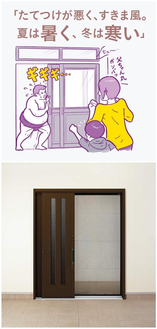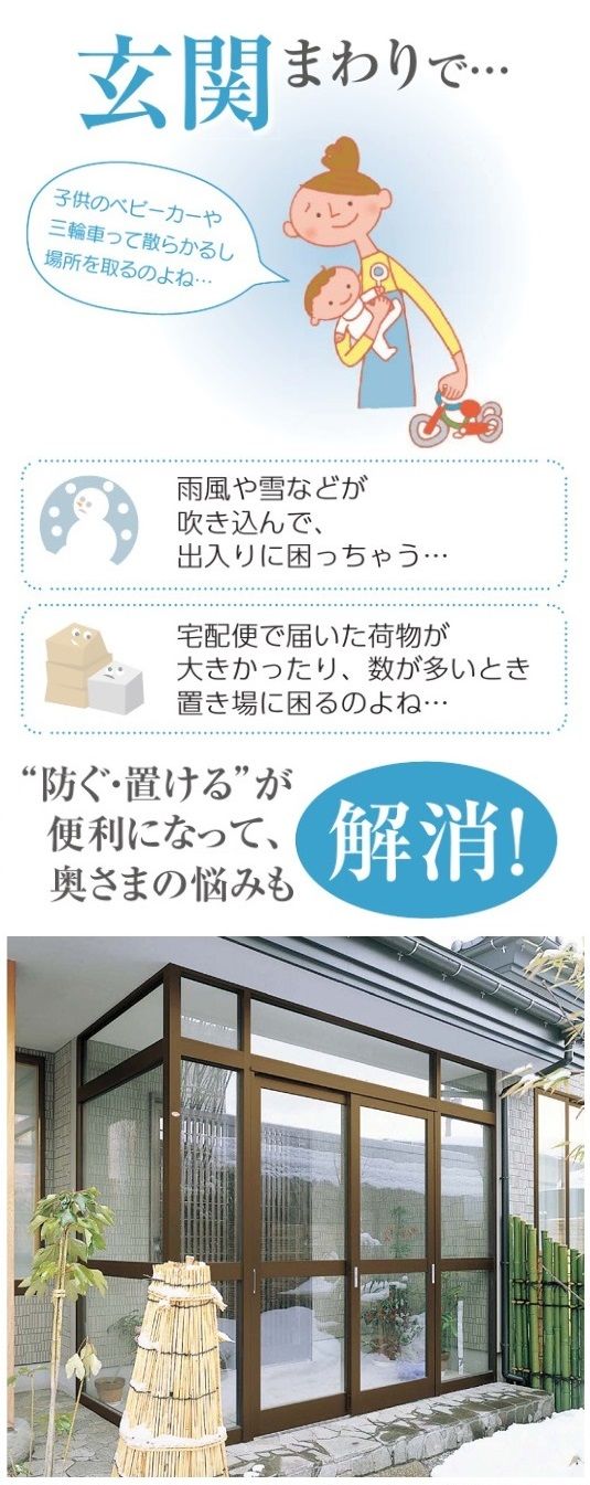》来店不要、現場確認、見積りは無料《 風除室の修理、風除室(雪囲い)新設工事は、富山県内全域に対応します。富山県西部:高岡市、射水市、氷見市、小矢部市、砺波市、南砺市富山県東部:富山市、滑川市、中新川郡、魚津市、黒部市、下新川郡 いい製品を、どこよりも安く! 「雨や雪、などが吹き込んで、出入りに困る」、「子供のベビーカーや三輪車って、玄関に置いとくとジャマよね・・・」、「宅配便で届いた荷物が大きかったり、数が多いとき置き場所に困るのよね・・・」など、風除室の修理から、リフォームニーズに対応した風除室の新設工事まで、住まいの囲い工事のことなら何でもお任せください。エクステリア工事の専門店です。 YKK AP 風除室 セフター3進化する住まいに、進化する風除室を。より美しく、より個性的に、より快適に、より使い勝手良く。住まいに対するニーズは、年々高まっています。特に、住まいの第一印象を決める玄関まわりは、こだわりが強くなっています。コーディネイトに、収納に、雪・風除けに。「セフター3」は、その全てにこだわり、新規格を充実。風除室の新しいスタンダードです。 窓を閉めたまま換気ができ、冬だけでなく夏も快適なエントランスに。ホコリや虫などの侵入も軽減し、1年中快適な空間は使い方自由自在。 》施工実績・トップクラス・創業42周年《 【工事の流れ】1.事前の打合せ。玄関まわりの大きさや風除室の種類を確認。2.工事開始。今ある玄関まわりに合わせて、風除室を設置。3.シーリング・建付調整・チェックを行い工事完了。 【工事期間】 約1日。 現場確認、見積りは無料!まずはお電話ください! 24時間受付 0120-375-345アルミ建材和田 〒933-0062 富山県高岡市江尻856-2 価格保証 かならず他店より安くします!ぜひ、ご相談ください! (社)日本サッシ協会加盟店(社)カーテンウォール・防火開口部協会加盟店 ◇スタッフは、(社)富山県建築組合連合会に加盟した高岡市の建築組合員です。富山県建築組合連合会では、市や町のご協力のもと県内13箇所で、『無料の住宅相談所』を開設しています。富山県の気候風土に適した丈夫で快適な新築や増改築はもちろん、住宅診断や耐震補強工事まで、住まいのことなら何でも、お気軽にご相談ください。 【富山県西部:営業エリア】高岡市、射水市、氷見市、小矢部市、砺波市、南砺市【富山県東部:営業エリア】富山市、滑川市、中新川郡、魚津市、黒部市、下新川郡 【所在地】富山県高岡市江尻856-2 Tel 0120-375-345 【取扱メーカー】三協アルミ、YKK AP、リクシル、旭硝子、日本板硝子、美和ロック、住友3M 来店不要!(電話で、24時間受付中!)